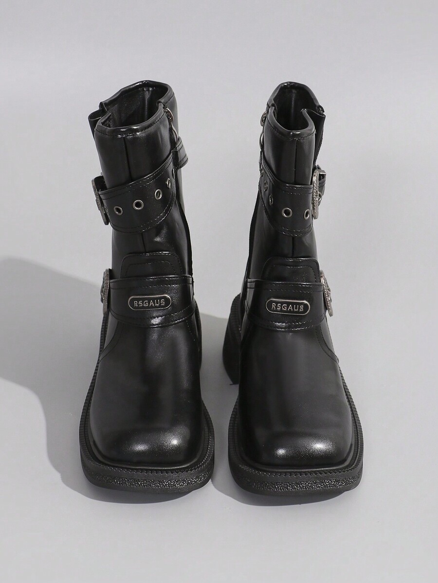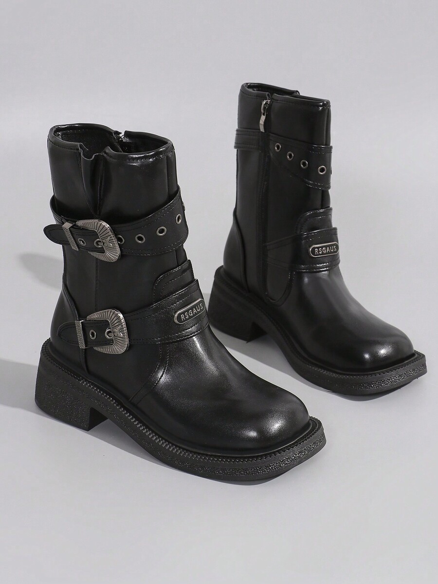Fairycore Women'S Mid Calf Boots Buckle Decor Chunky Motorcycle Boots Cowboy Western Square Toe Heel Biker Boots
