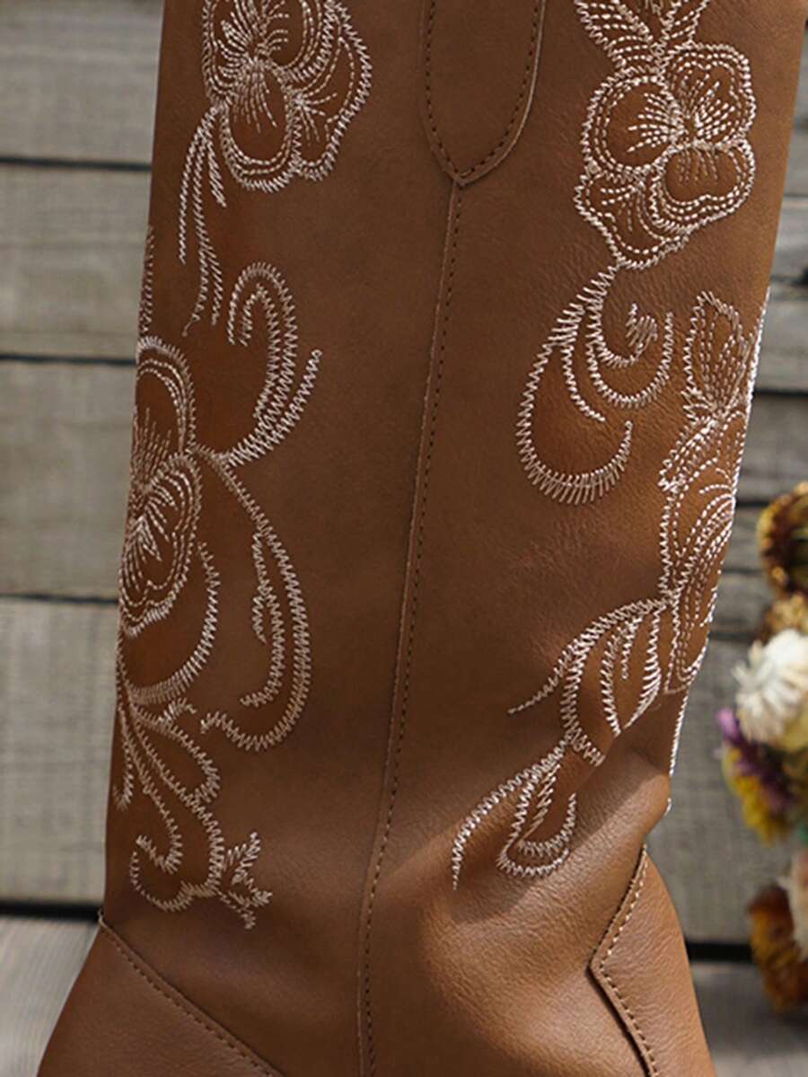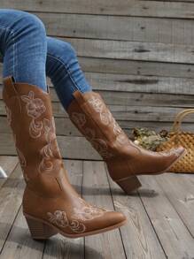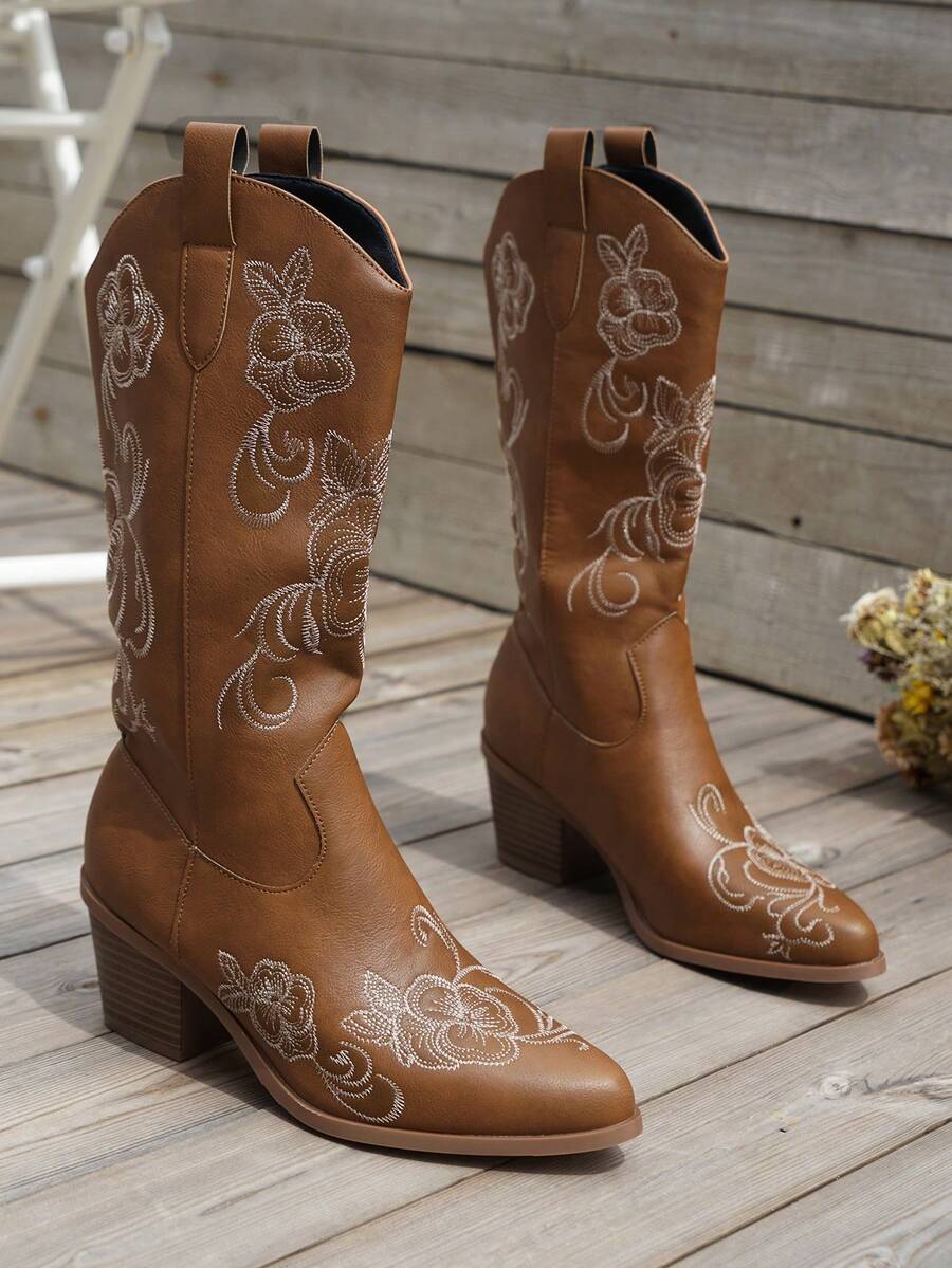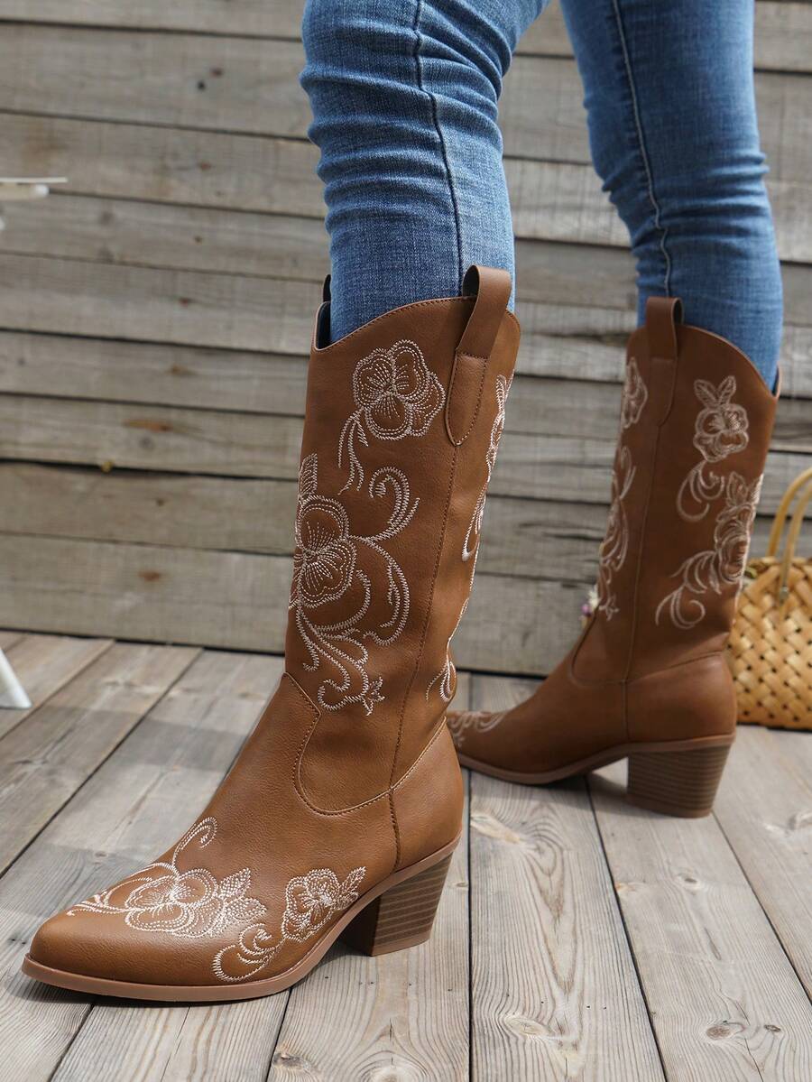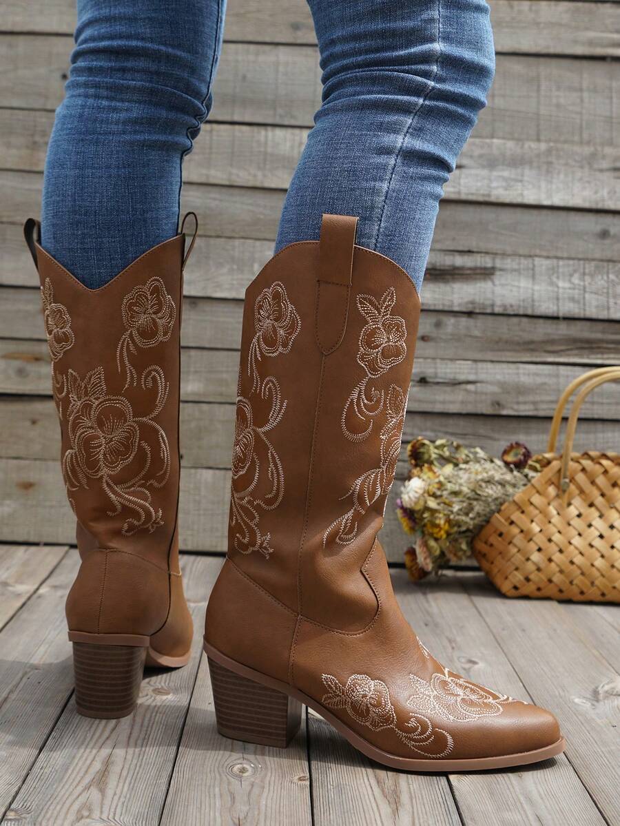 Fairycore Women's 2024 New Spring & Autumn Mori Style Brown Pointed Toe Embroidered Western Cowboy Boots With Low Chunky Heels, Mid-Calf