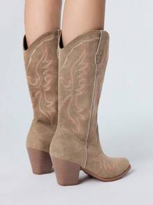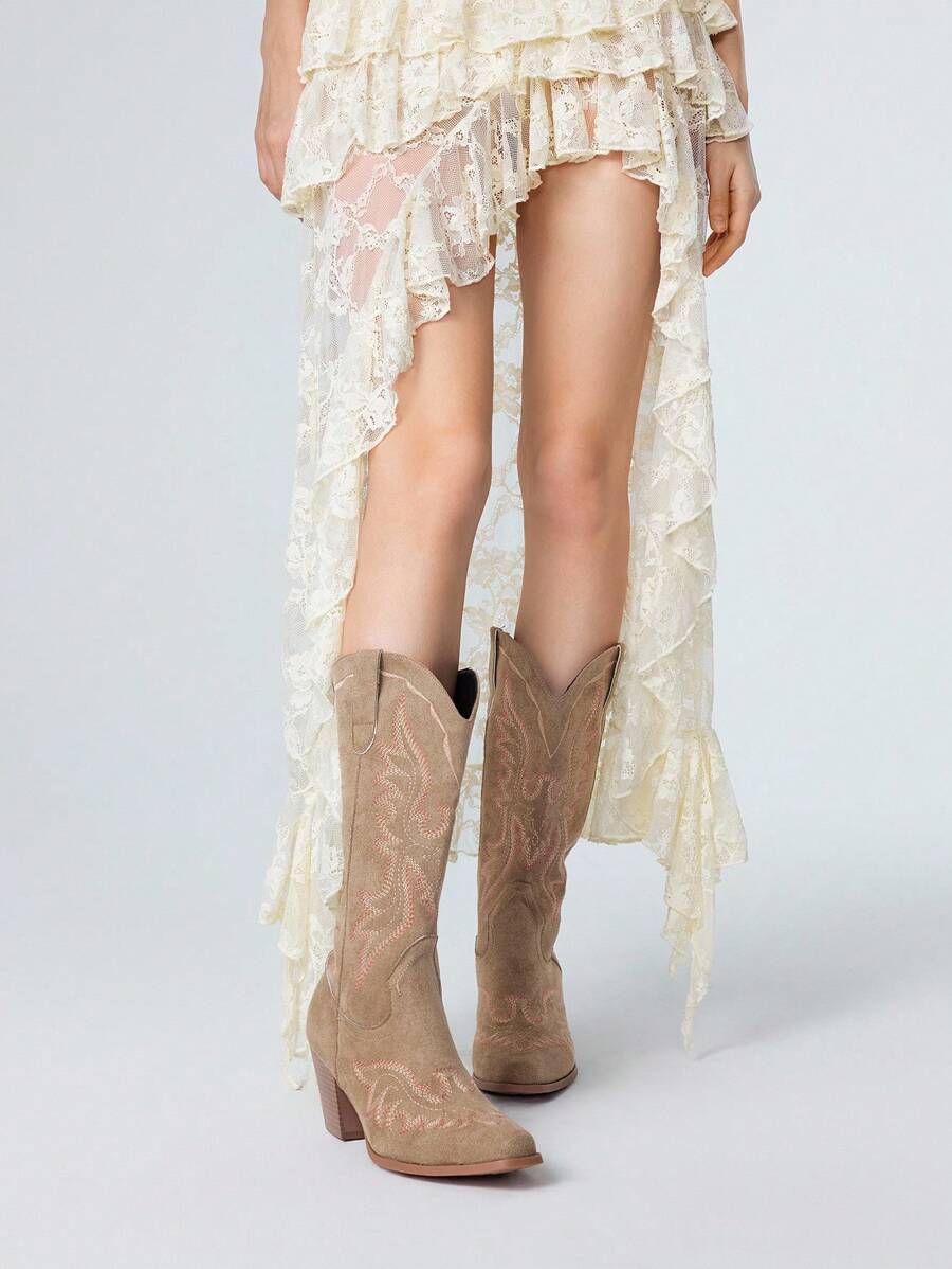 Fairycore Women's Cowgirl Boots With Slip-On Design, Contrast Color Details, Embroidered Western Style Boots, Outdoor Fashion Casual Mid-Calf Riding Boots