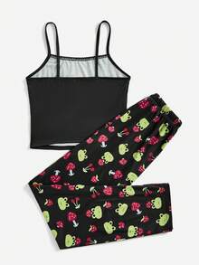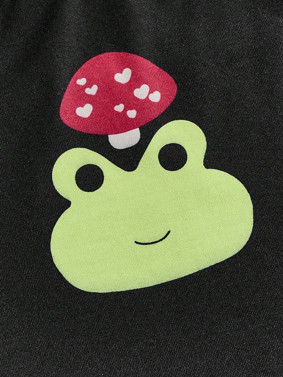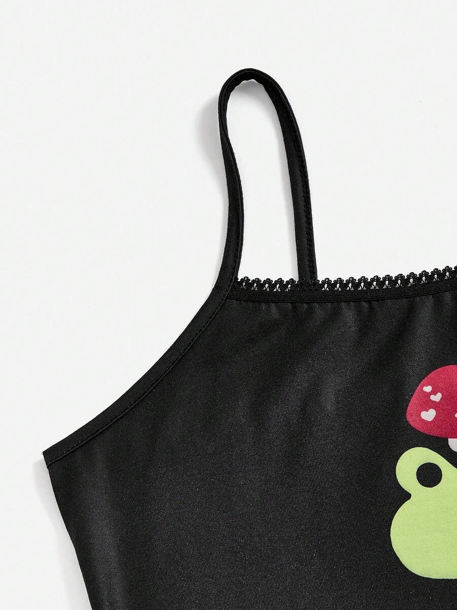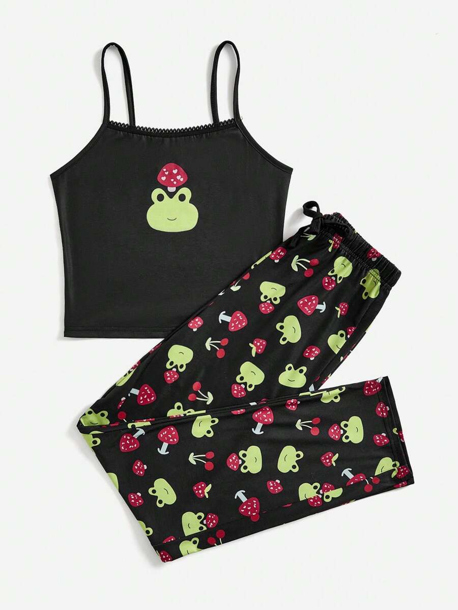 Fairycore Women's Cute Frog & Mushroom Patchwork Lace Trimmed Cami Pajama Set