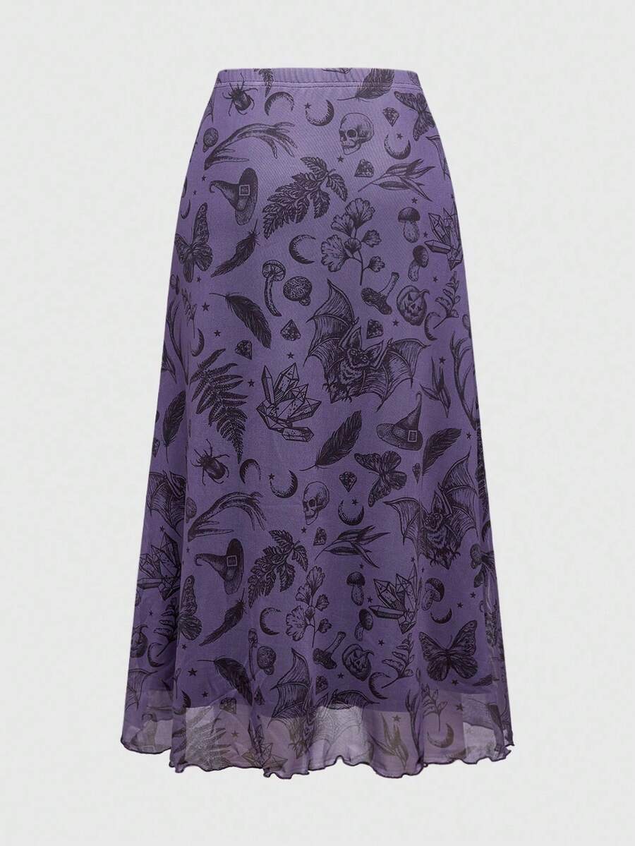 Fairycore Women's Dark Gothic Bat, Skull, Moon, Pumpkin Print A-Line Punk Mini Skirt
