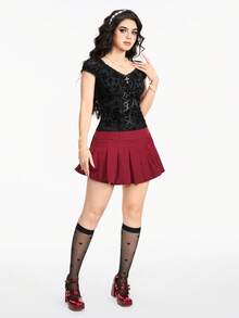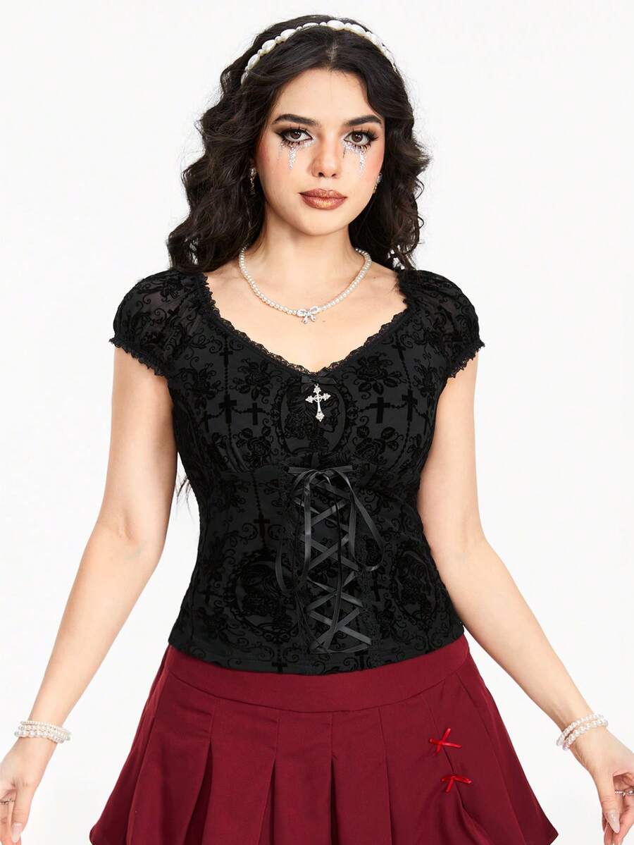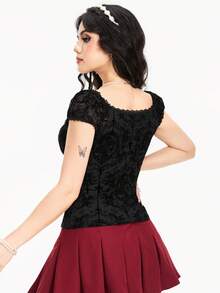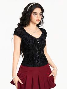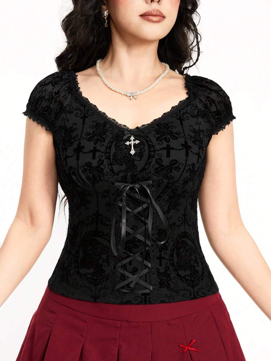 Fairycore Women's Flocked Fabric Retro Palace Style Bowknot Lace Trimmed T-Shirt