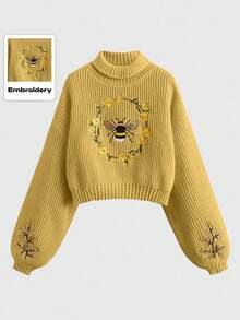 Fairycore Women's Floral & Bee Embroidered Dropped Shoulder Long Sleeve Casual Sweater, Autumn/Winter