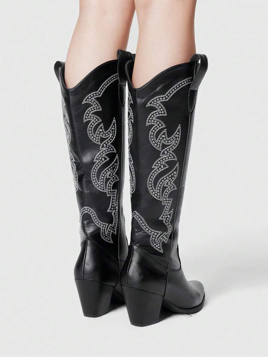 Fairycore Women's Pointed Toe Glitter Embroidery Western Boots, Leather Knee-High Boots, Fashionable Outdoor Spring/Autumn New Arrival