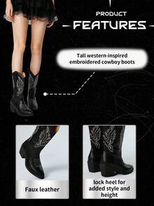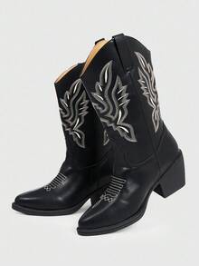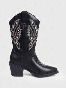 Fairycore Women's Pointed Toe Goth Punk Rock Ankle Boots, Black Embroidered Thick Heel Buckle Strap Western Cowboy Mid-Calf Boots, Halloween