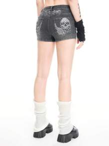 Fairycore Women's Rhinestone Studded Skull & Wing Pattern Casual Denim Shorts, School