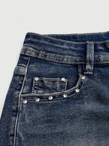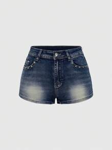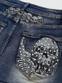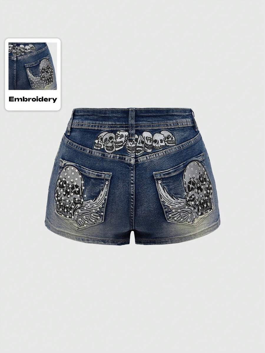 Fairycore Women's Skeleton Head Embroidery Rhinestone Decorated Denim Shorts