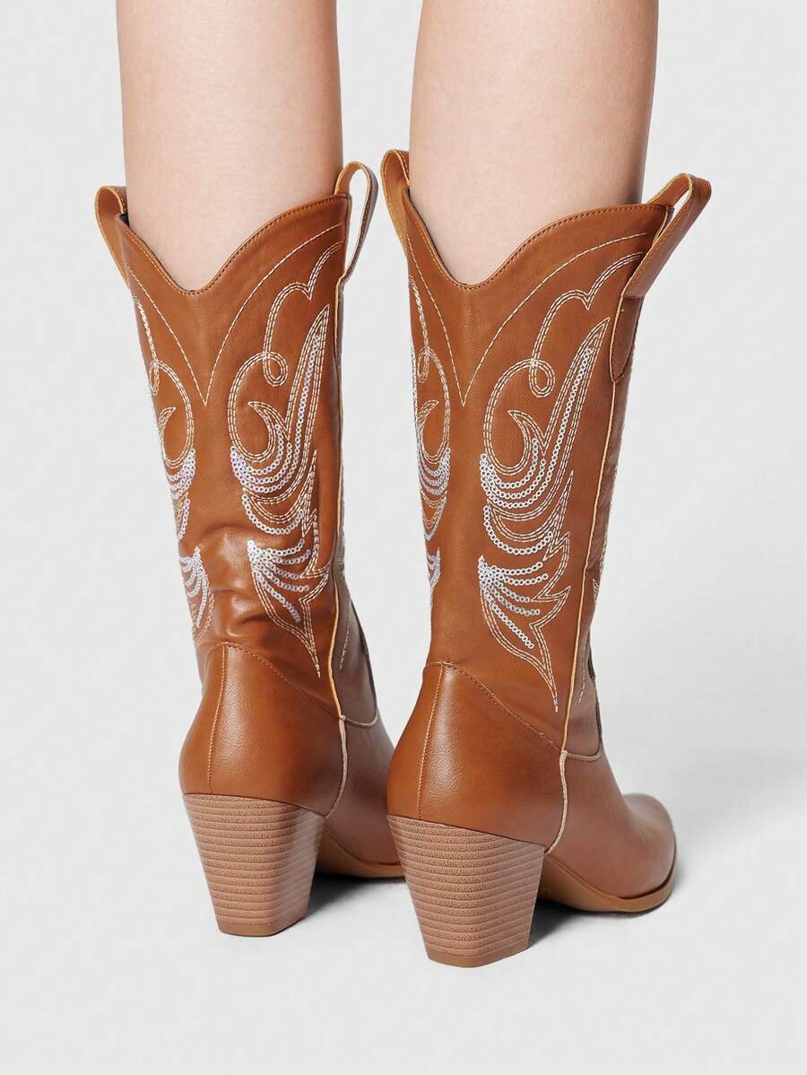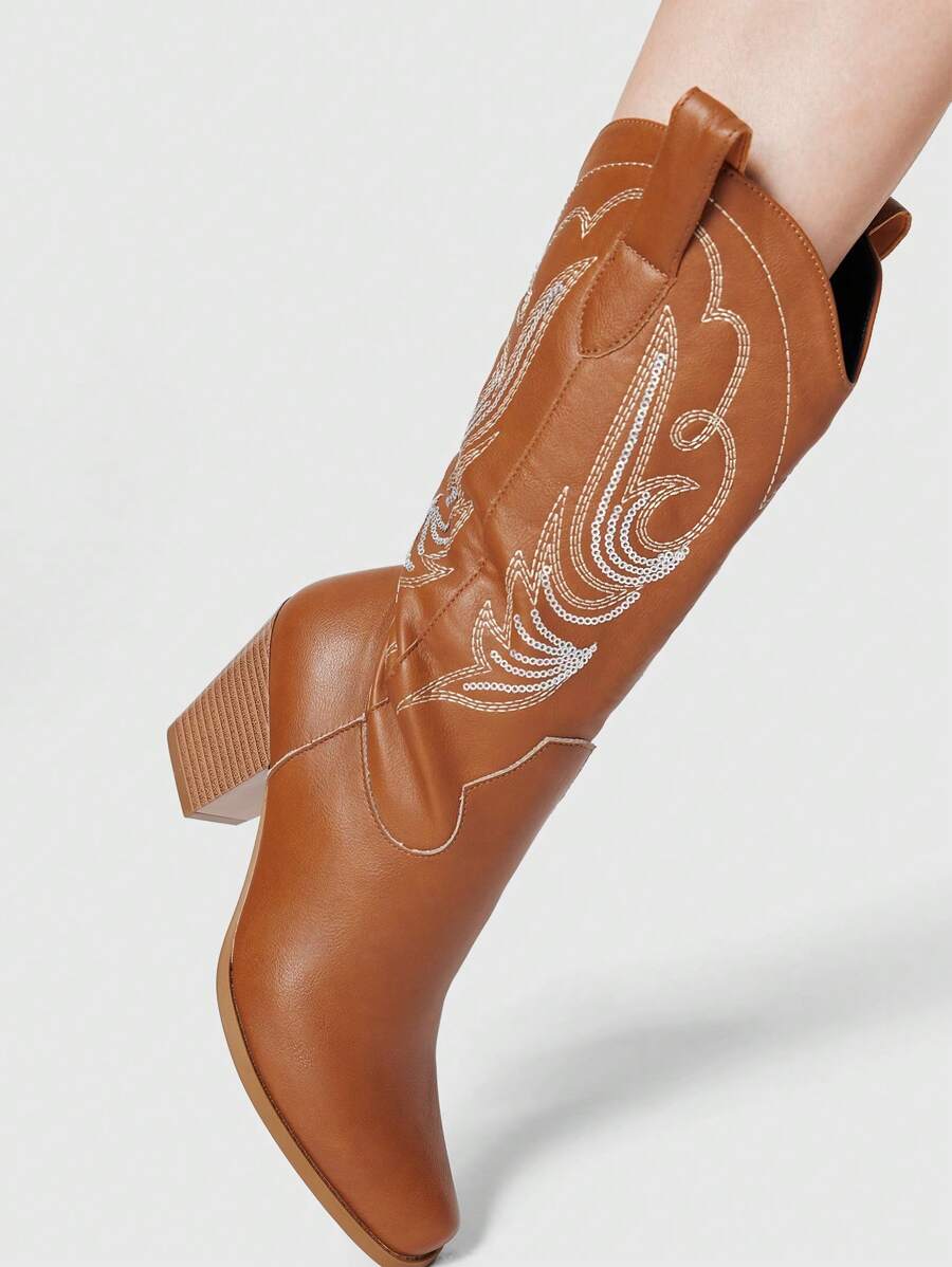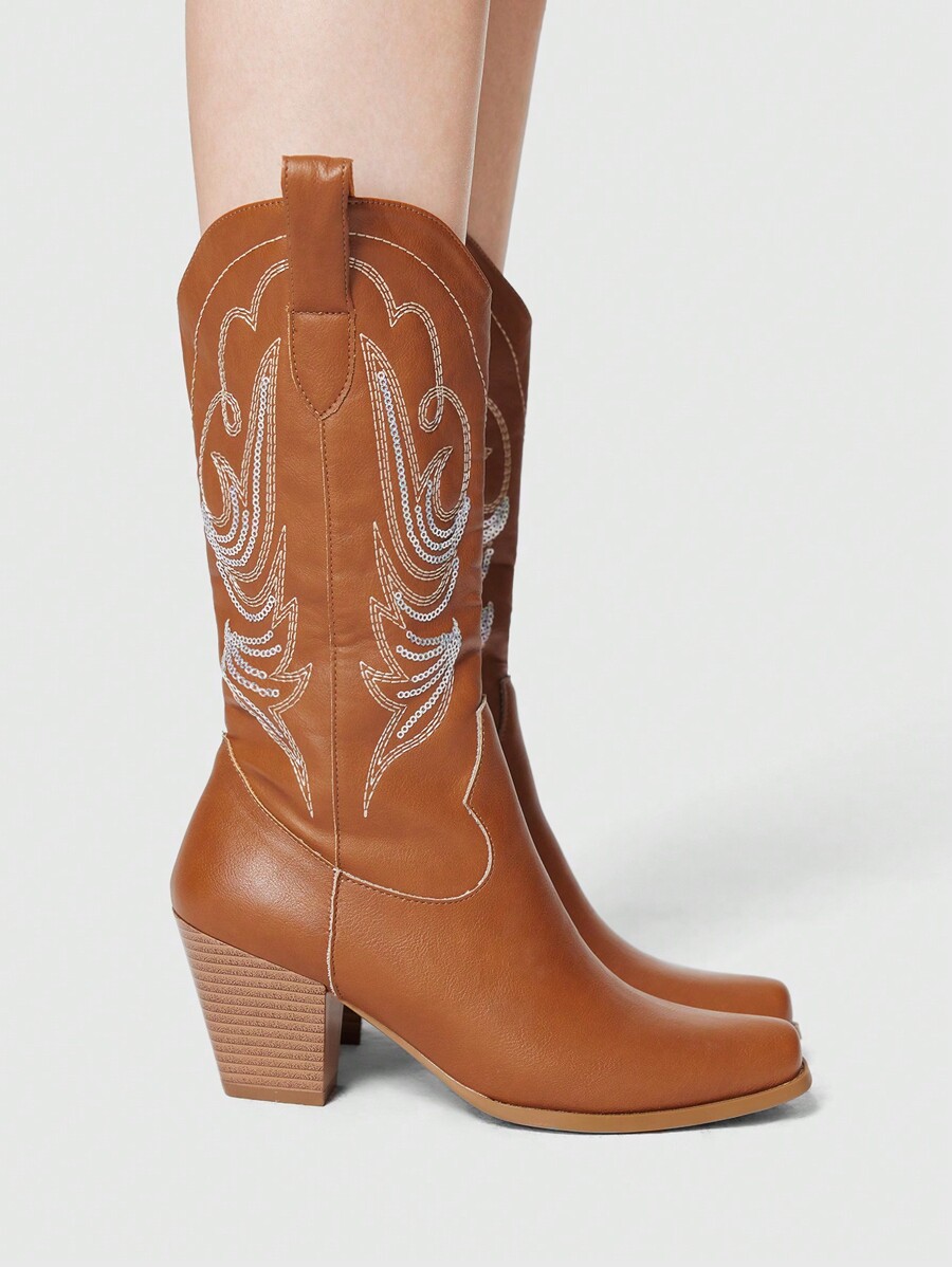 Fairycore Women's Square Toe Chunky Heel Embroidered Western Cowgirl Boots, Slip-On Outdoor Fashion Leather Mid-Calf Boots, New For Spring/Autumn