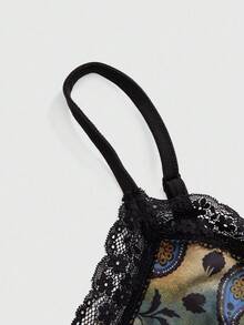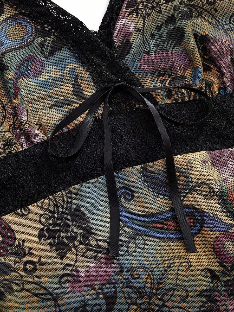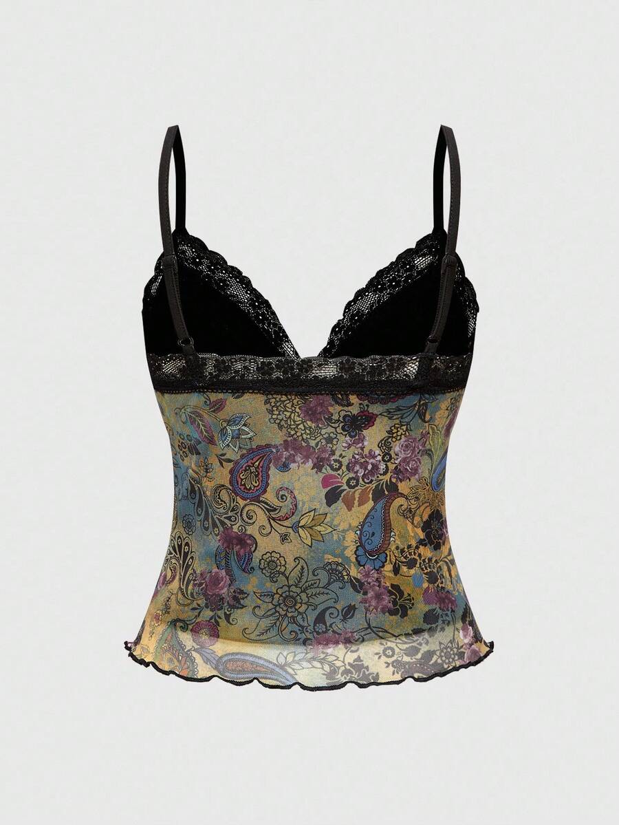Fairycore Women's Summer Vacation Paisley Print Contrast Lace Tie Front Fitted Camisole