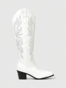 Fairycore Women's Totem Embroidery Pointed Toe Chunky Heel PU Retro Western Boots, White, Casual Outdoor Campus