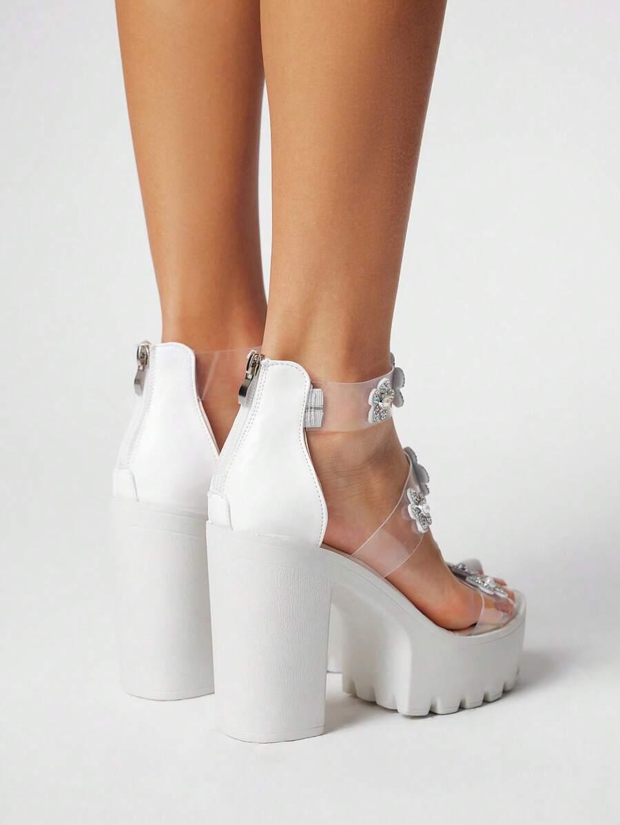 Fairycore Women's White High Heel Shoes, Peep Toe Crystal Rhinestones Shiny Dress Shoes, Thick Heel Transparent Crystal Flower 3D Gothic Y2K High Heel Sandals