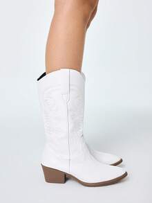 Fairycore Women's White Western Embroidered Pull-On Ankle Boots, Leather Motorcycle Knee-High Boots, Chunky Heel Mid-Calf Boots