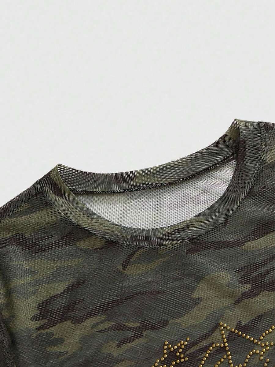 Grunge Punk Fall Women Clothes Y2K Baddie Vintage Camouflage Mesh Studded Long Sleeve Fitted Top For Women, Autumn