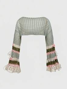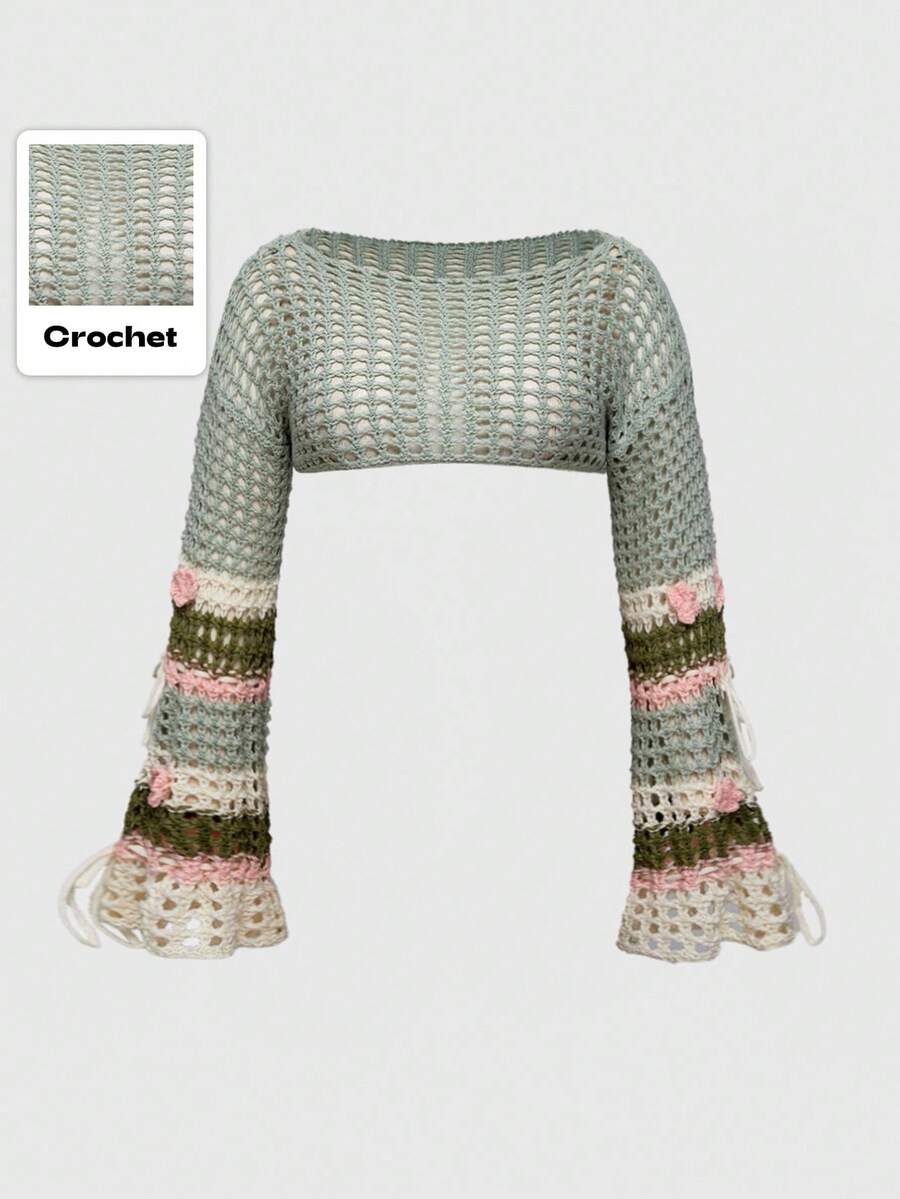 Fairycore Fariycore Autumn/Winter Mori Style Mori Kei Mesh Knit Patchwork Striped Floral Long Sleeve Green Plus Size Sweater, Subculture Fairy-Like Plus Size Autumn/Winter Long Sleeve Women Knitwear