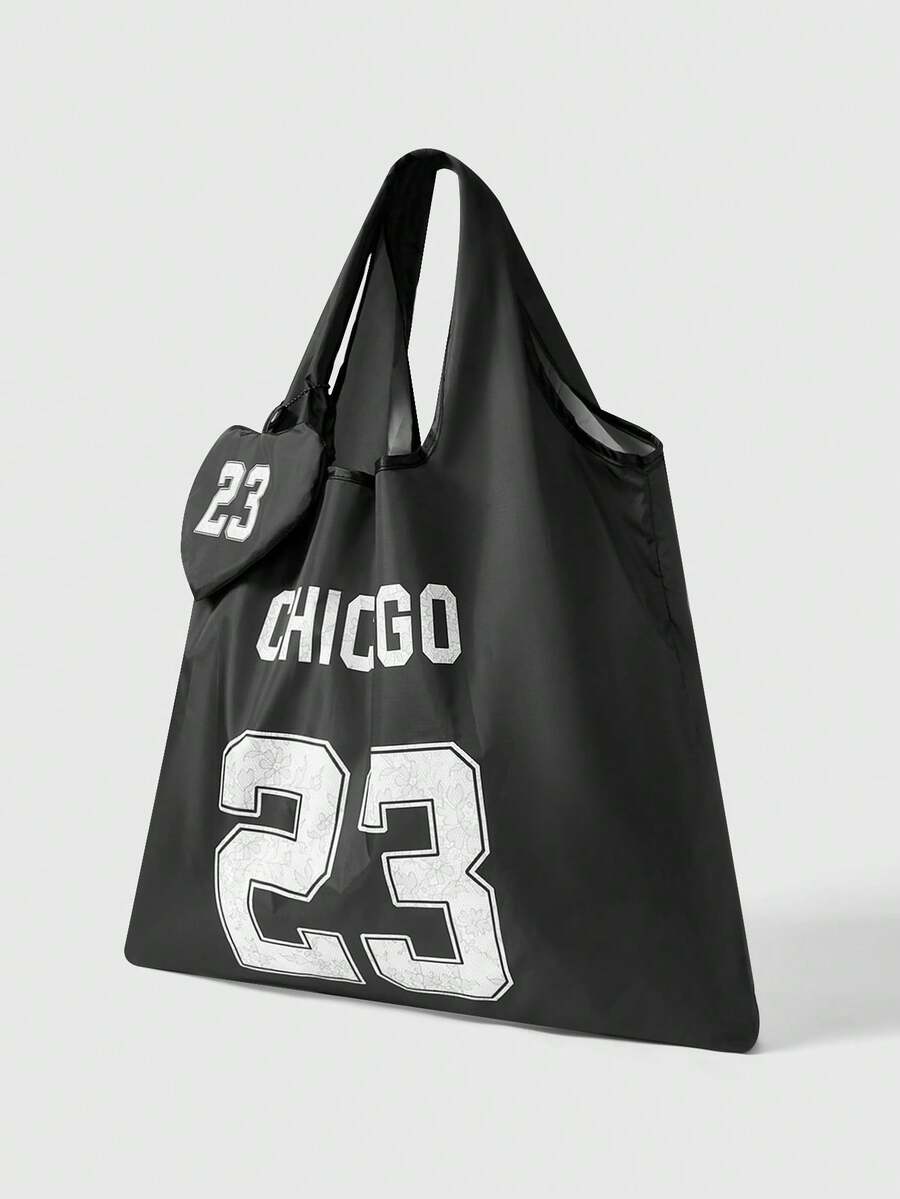 Grunge Punk Fashion Minimalistic Lace & Numeral Print Pattern Tote Bag, Large Capacity Portable Foldable Shopping Bag With Coin Pouch