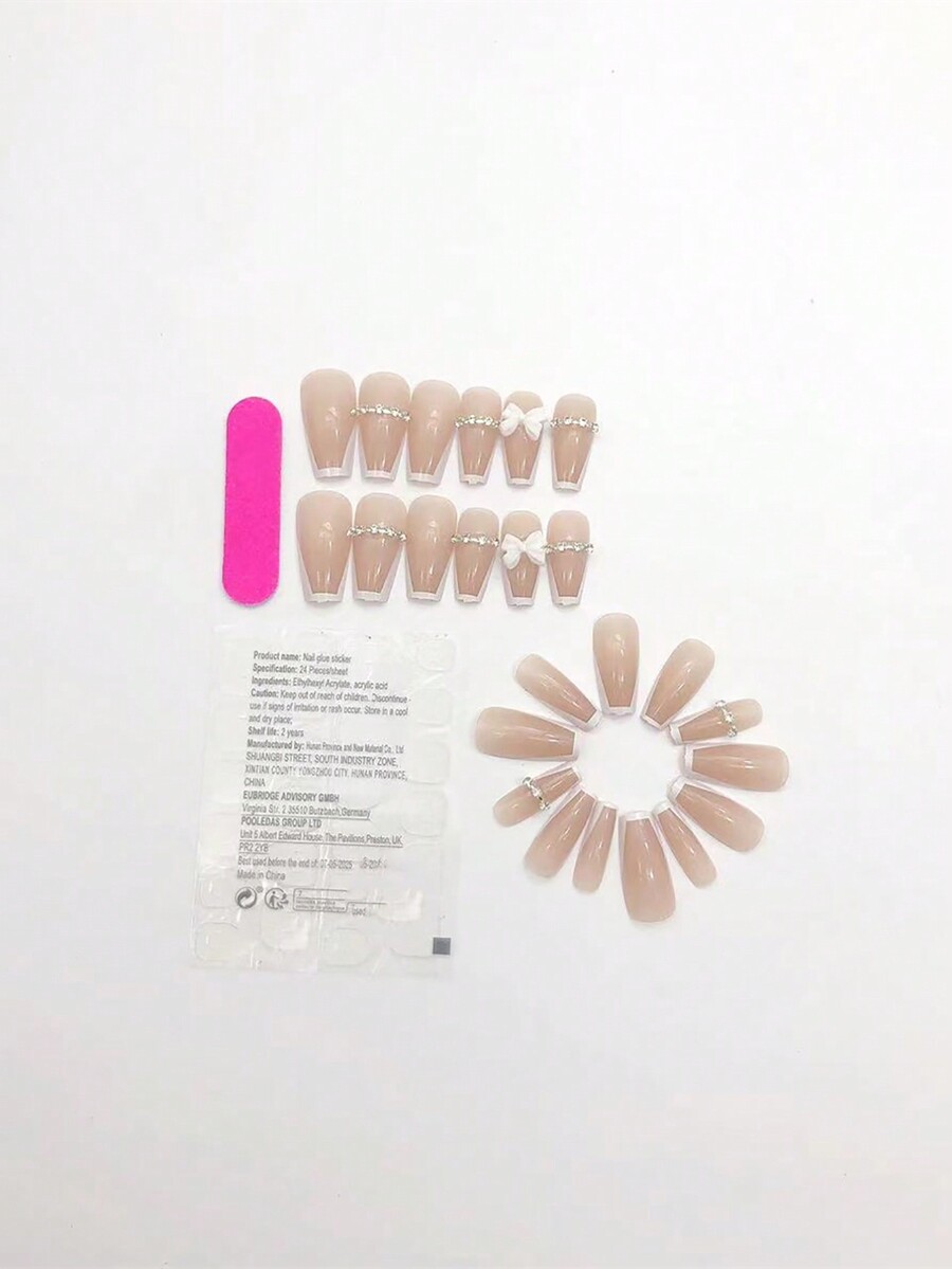 Fairycore Fashionable Nude Tone Bow Decor False Nails With Rhinestone Embellishment