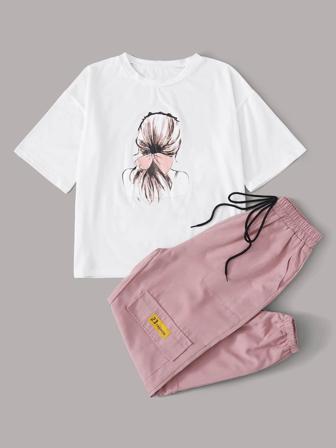 Figure Graphic Tee With Drawstring Pocket Detail Cargo Pants