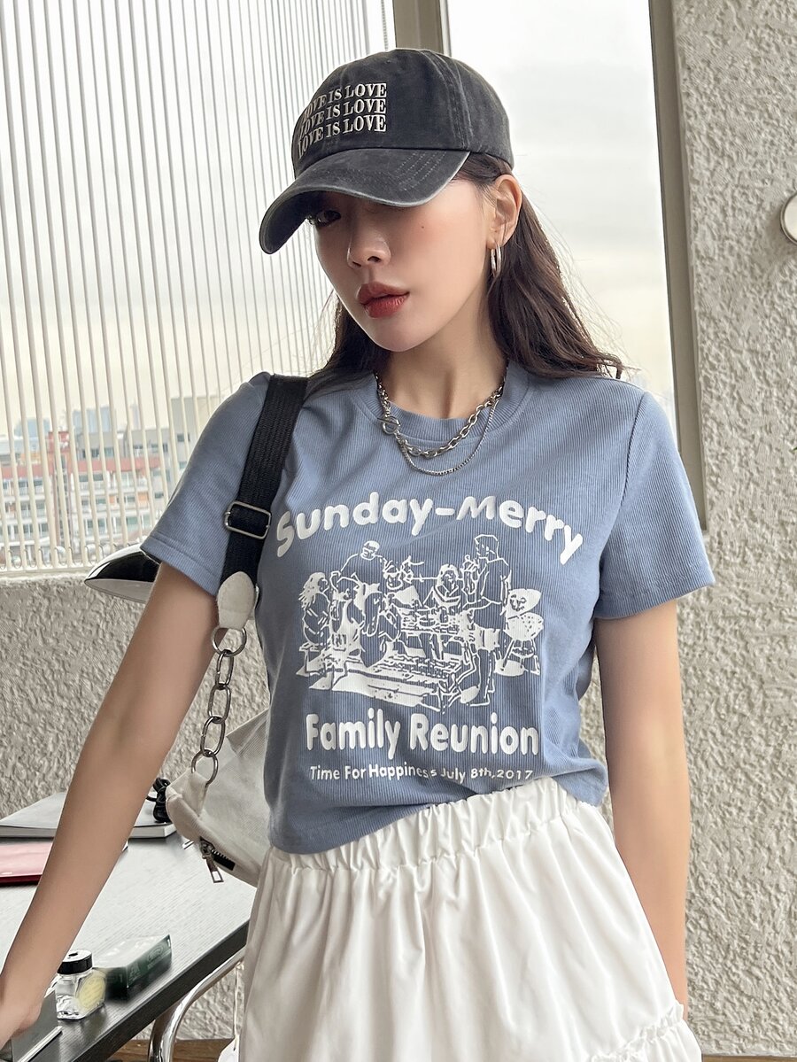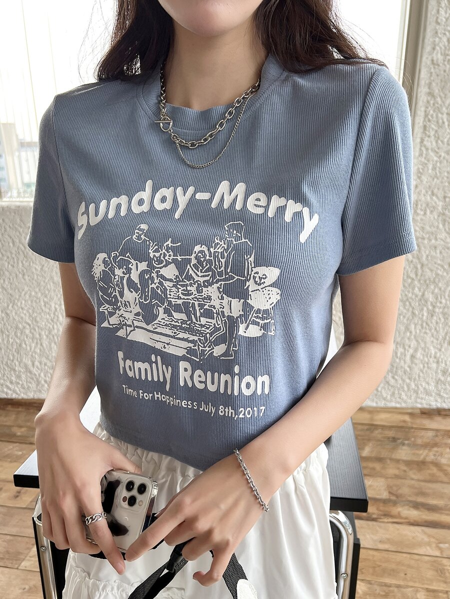 Figure & Letter Graphic Rib Knit Tee Sunday Merry Family Reunion Time For Happiness July 8th,Crop Tops Women