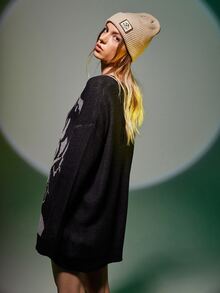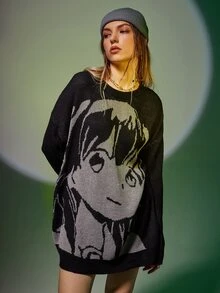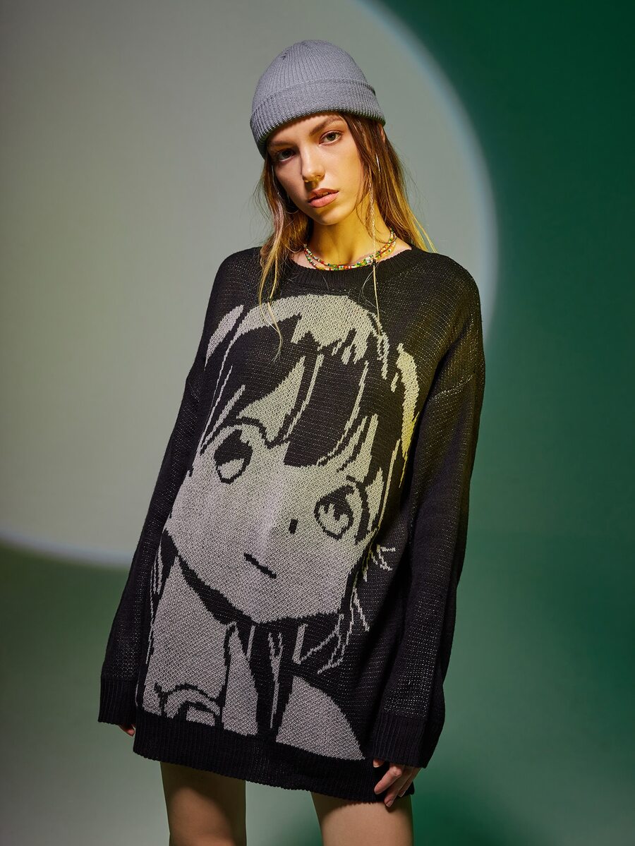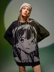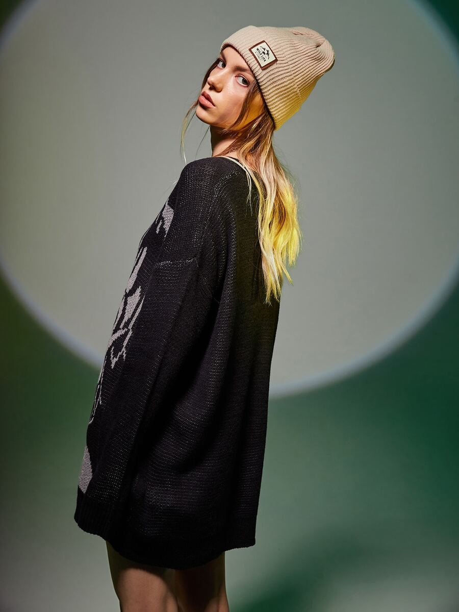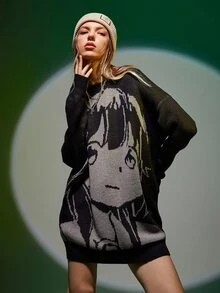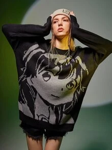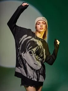 Figure Pattern Drop Shoulder Oversized Sweater