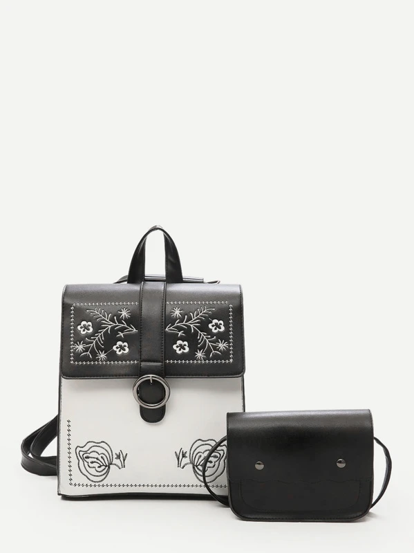 Floral Embroidered Backpack With Crossbody Bag