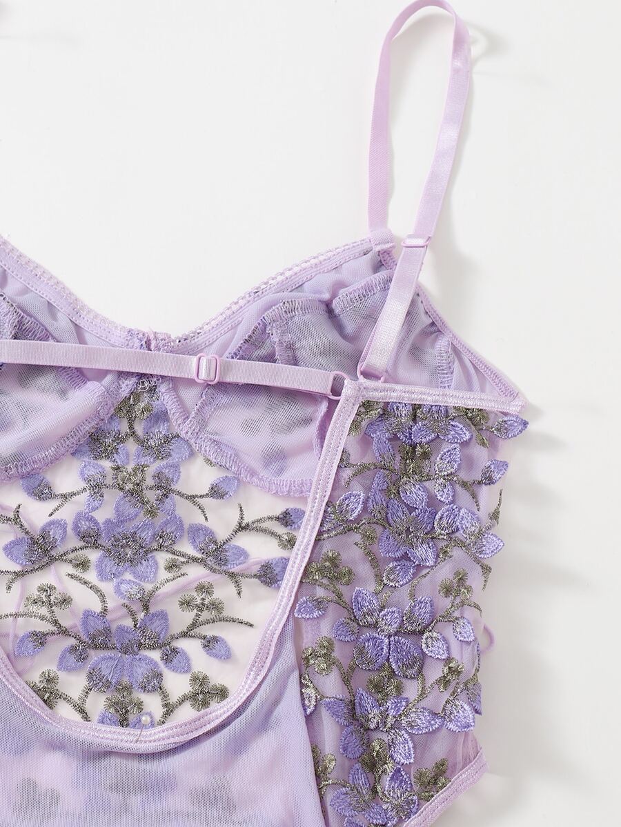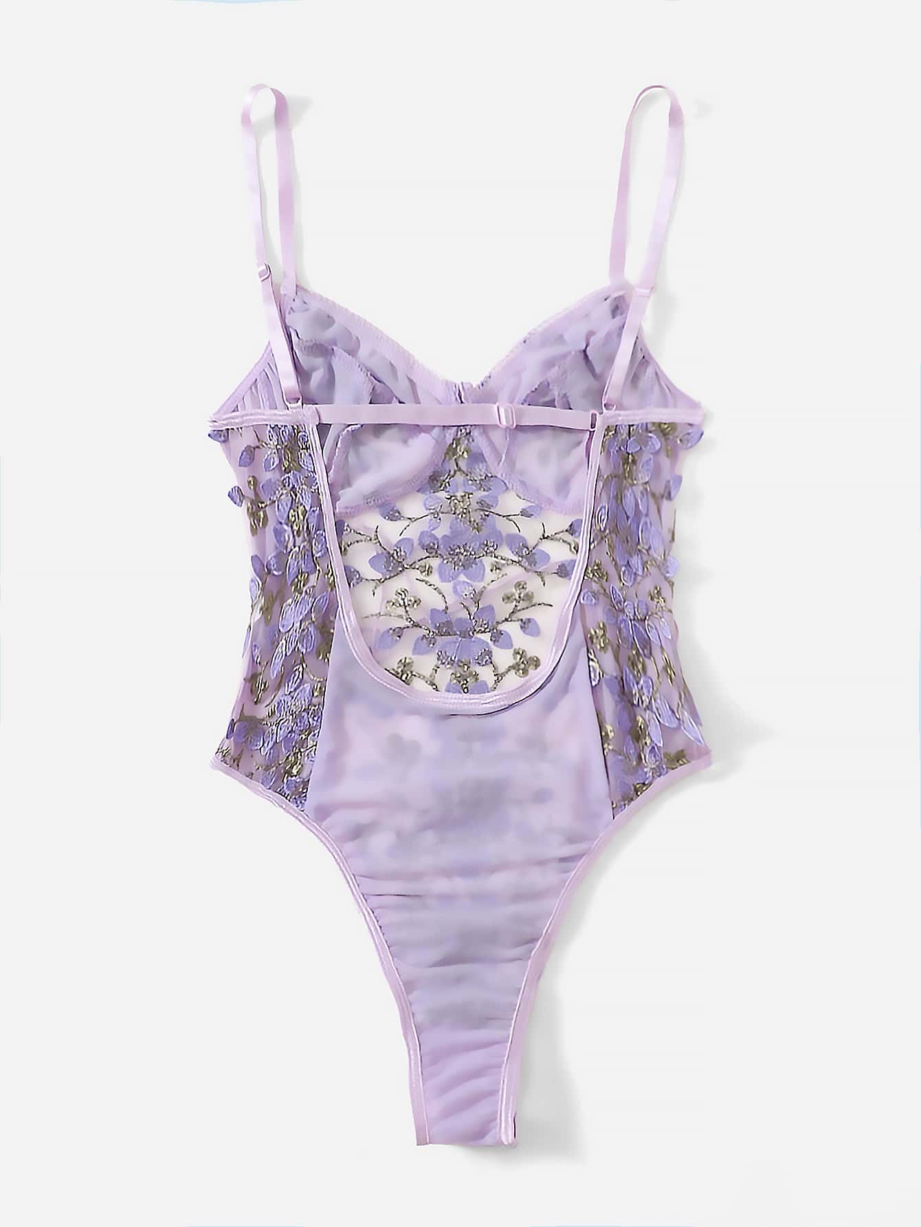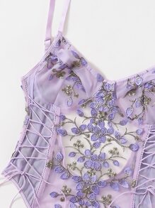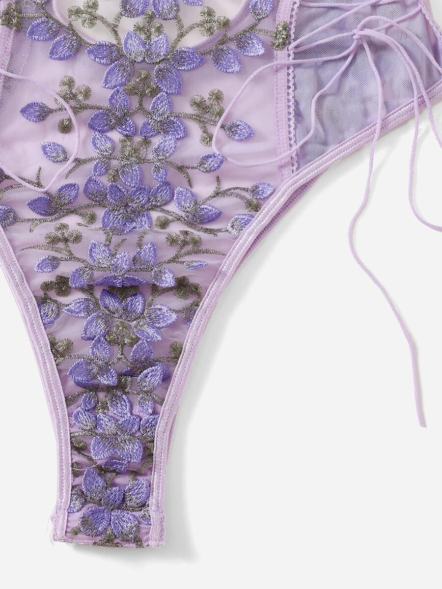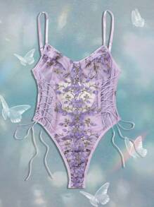 Floral Embroidered Mesh Lace-up Side Teddy Bodysuit