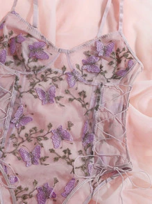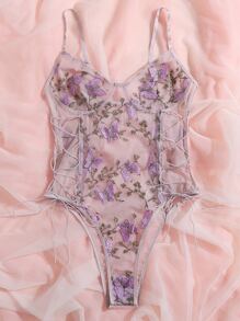 Floral Embroidered Mesh Lace-up Side Teddy Bodysuit