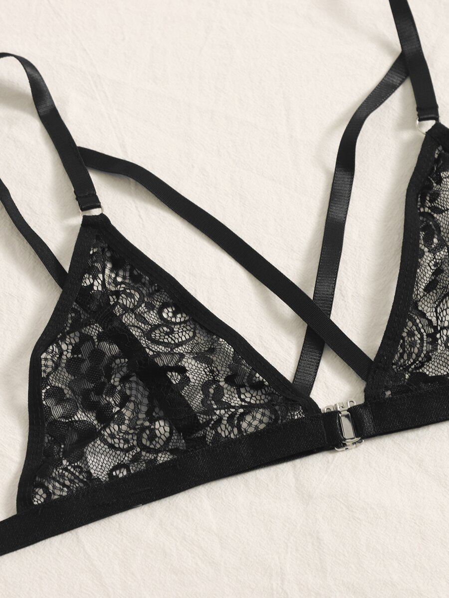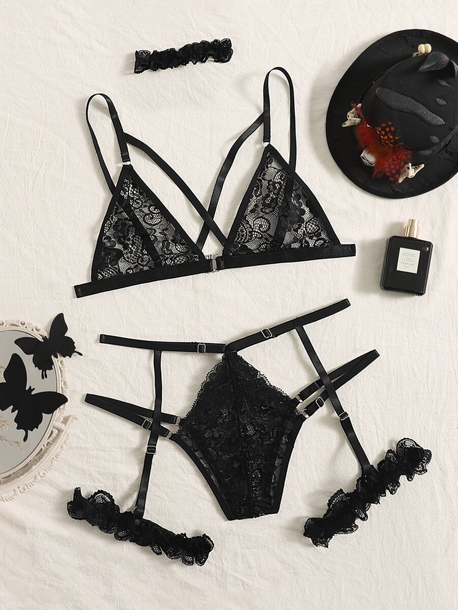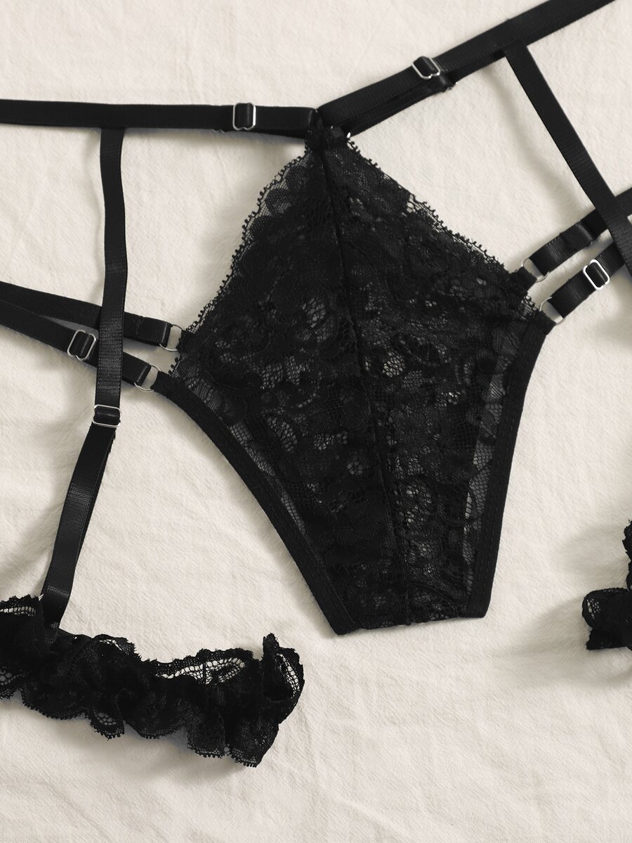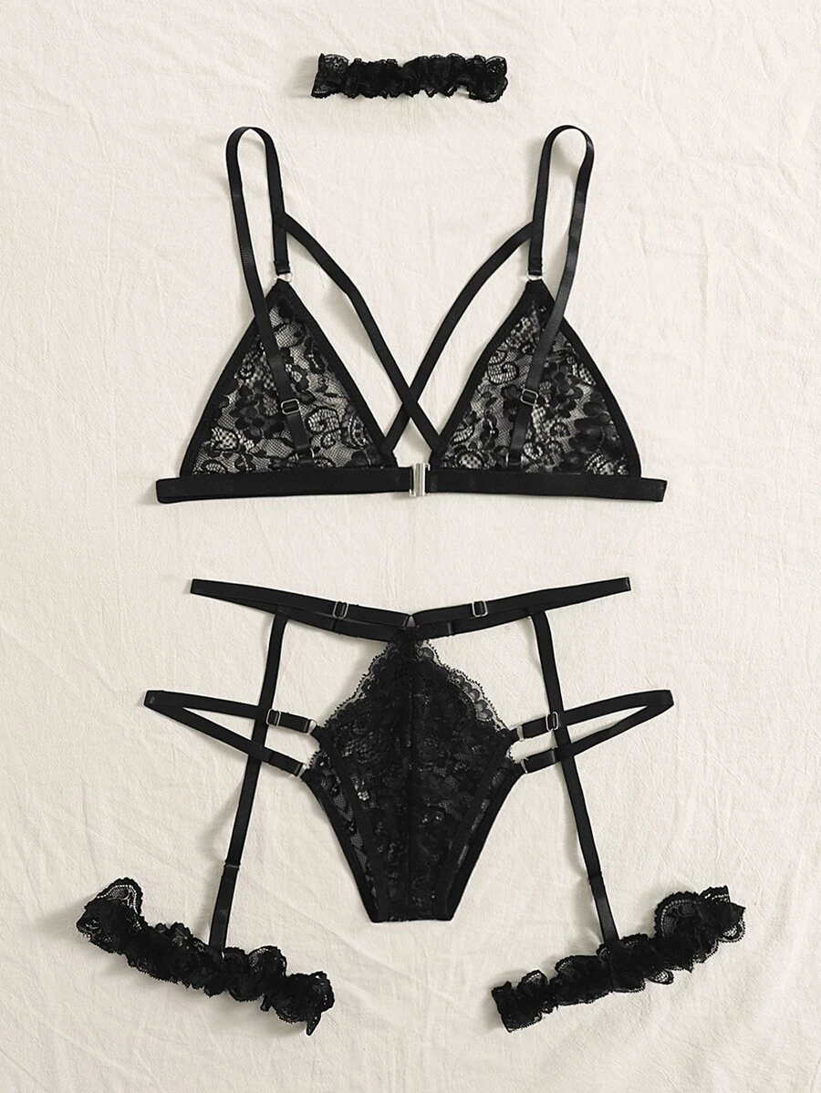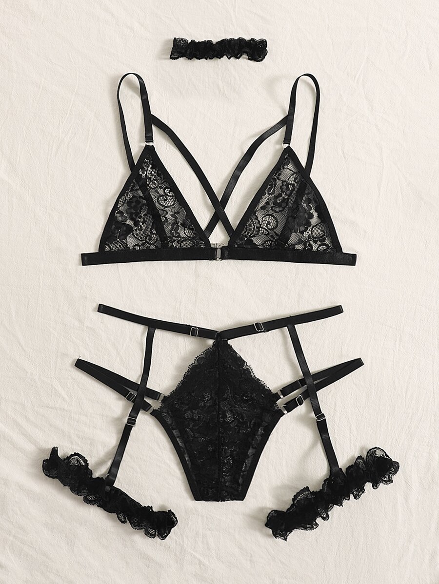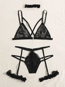 Floral Lace Garter Lingerie Set With Choker
