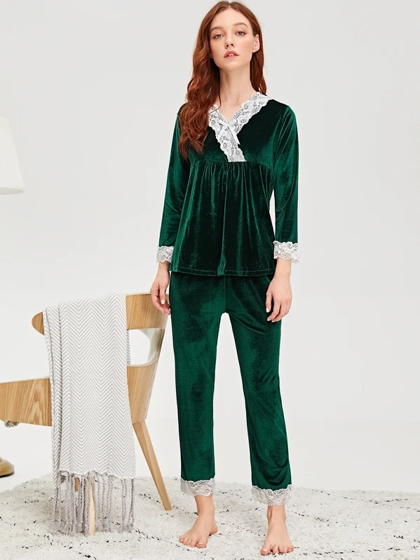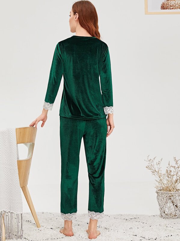 Floral Lace Trim Velvet Pajama Set