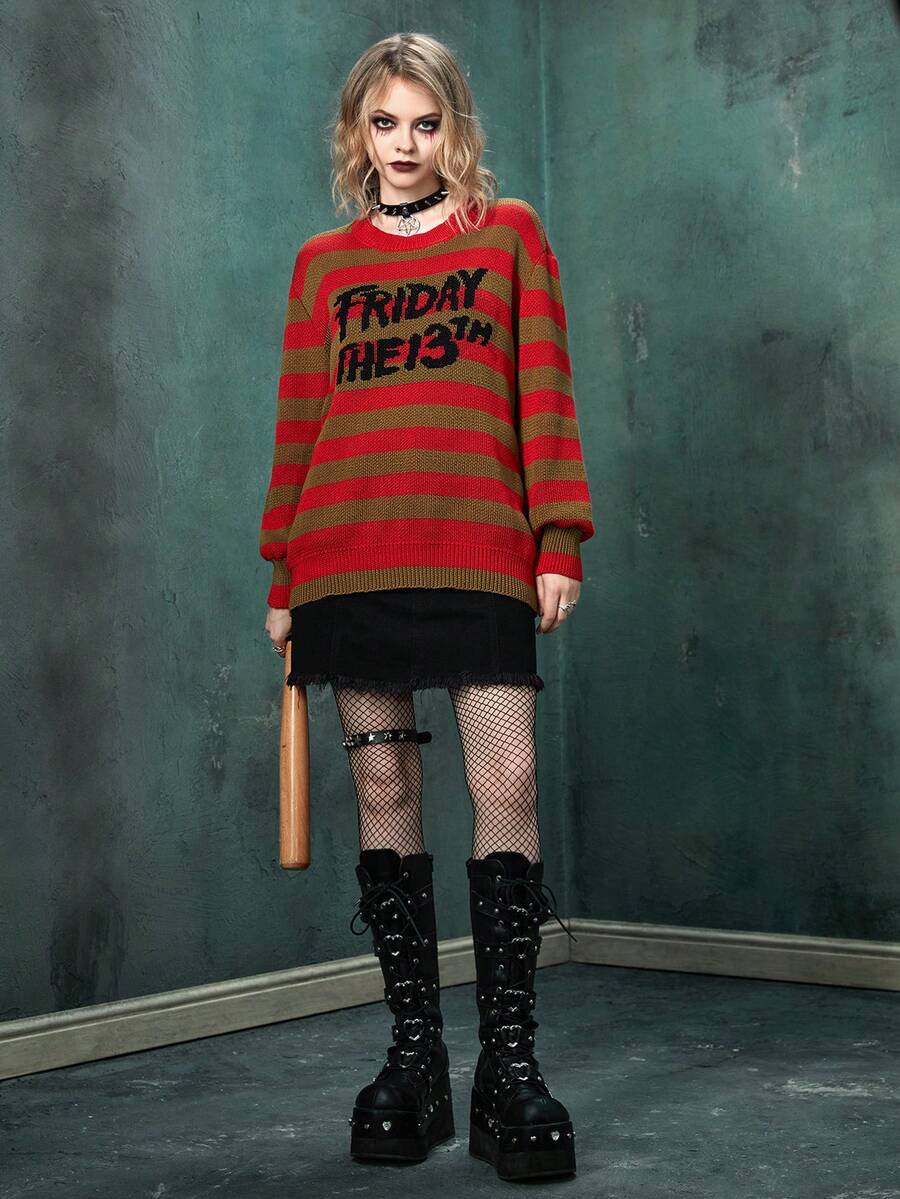 Friday the 13th X ROMWE Slogan Pattern Striped Drop Shoulder Sweater