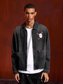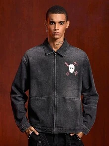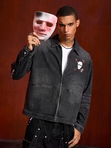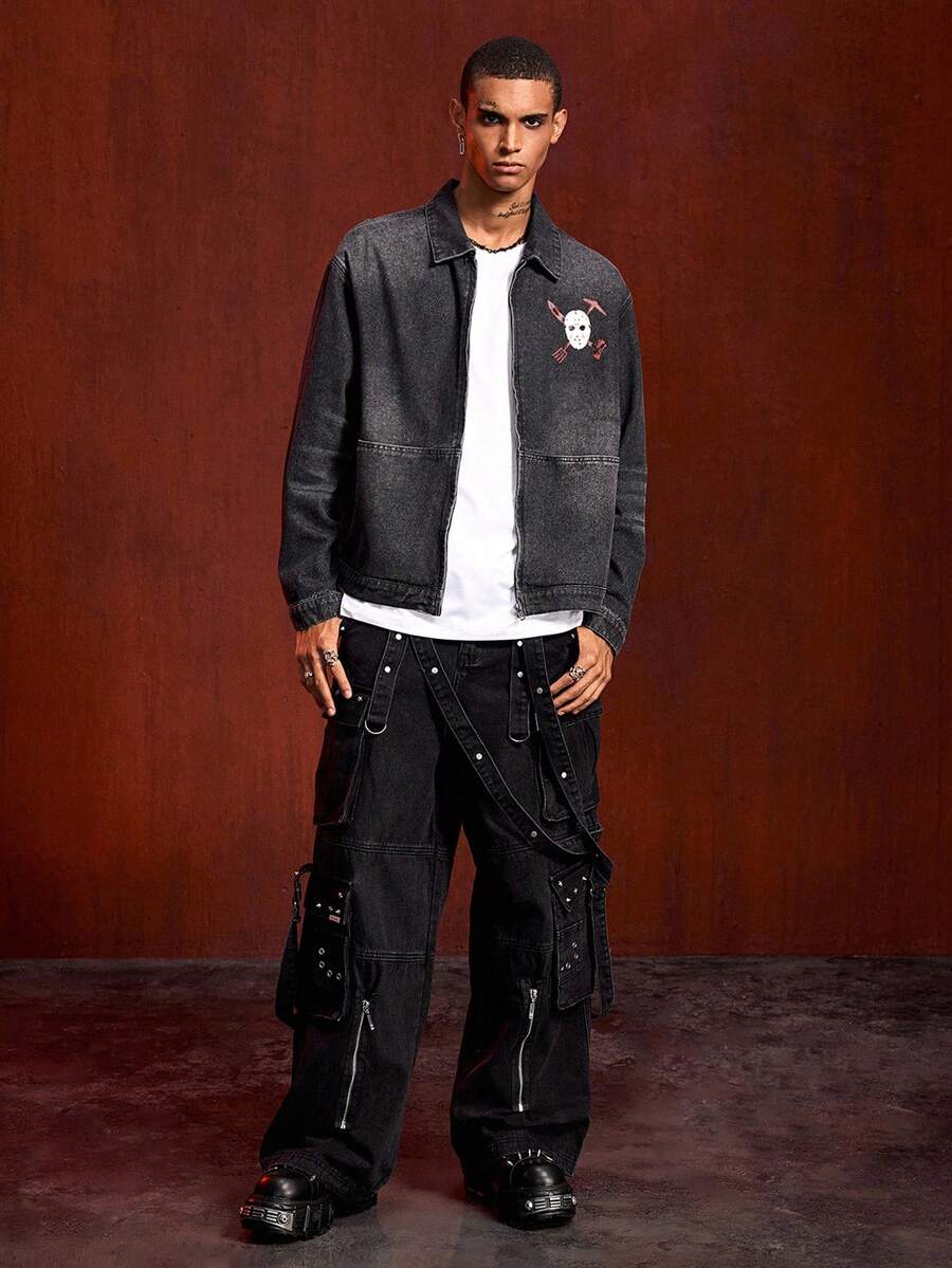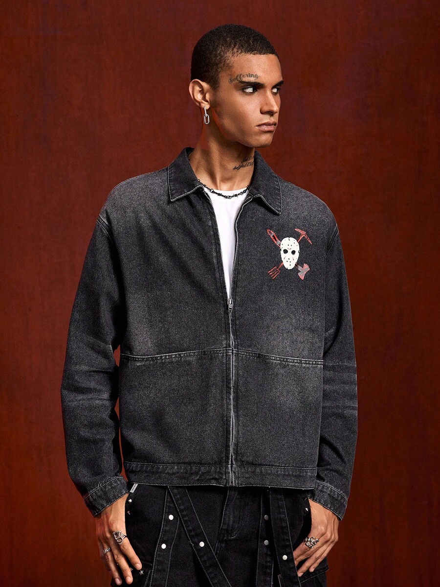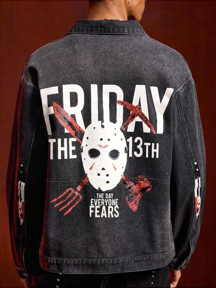 Friday the 13th X ROMWE Street Life Men's Letter & Mask Graphic Casual Long Sleeve Denim Shirt