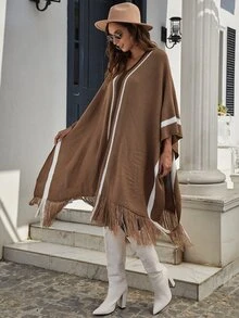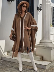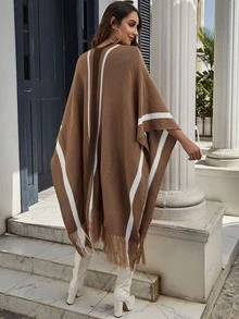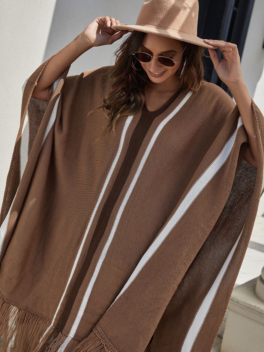 Fringe Hem Striped Poncho Sweater