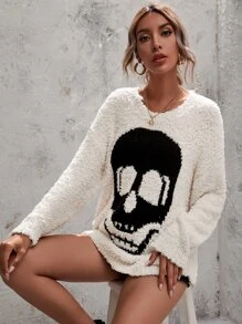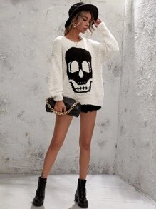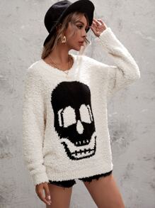 Fuzzy Knit Skull Graphic Sweater