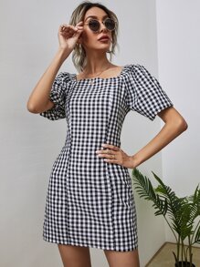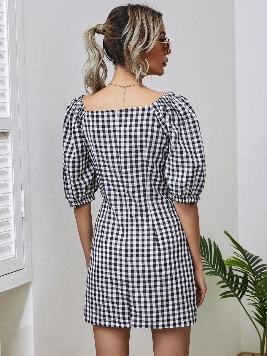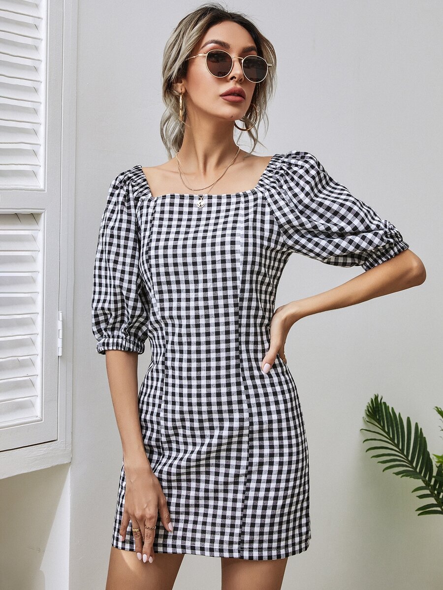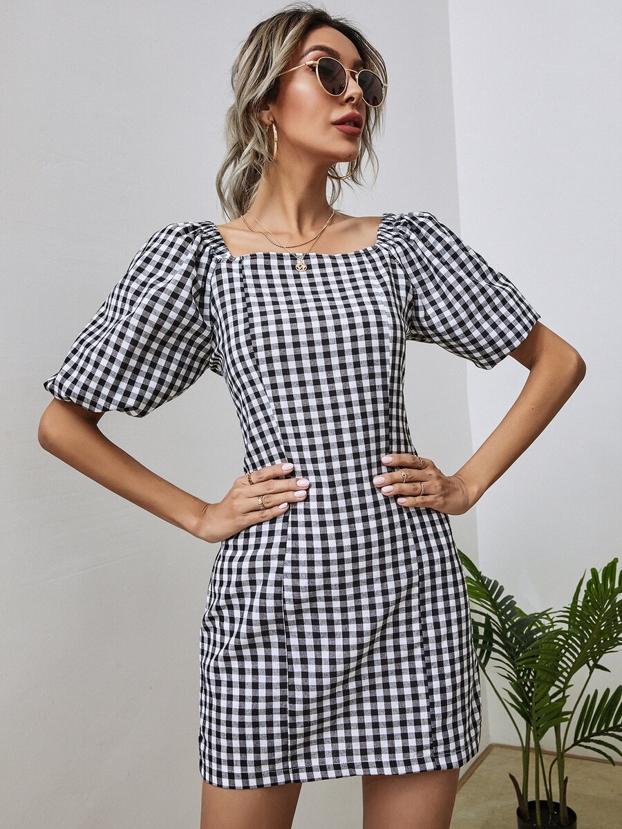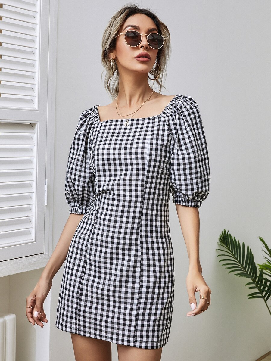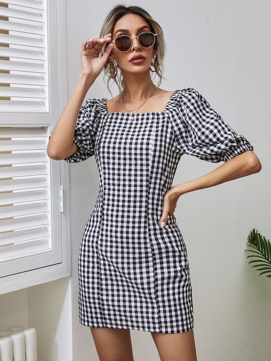 Gingham Square Neck Fitted Dress