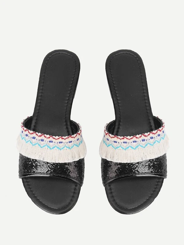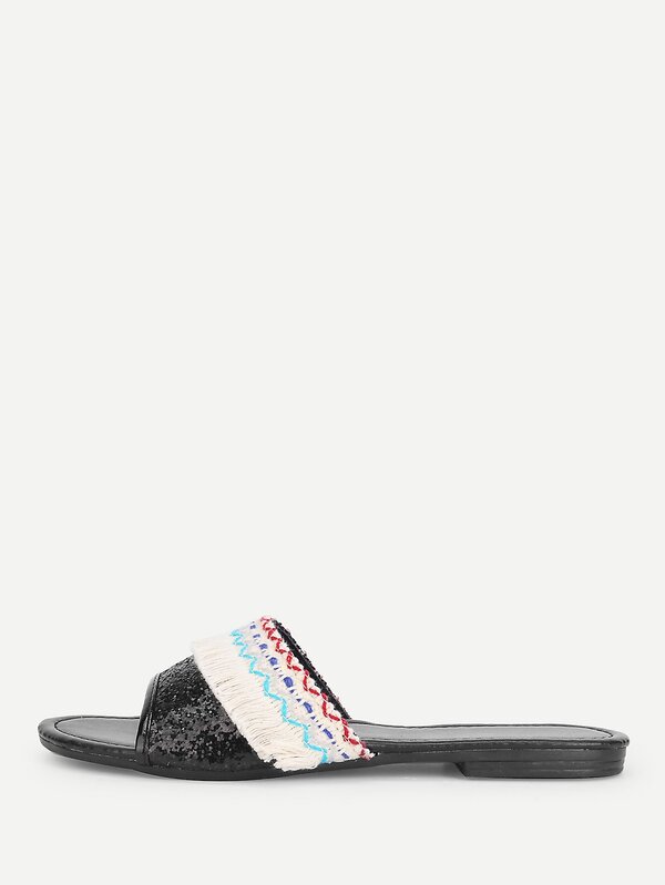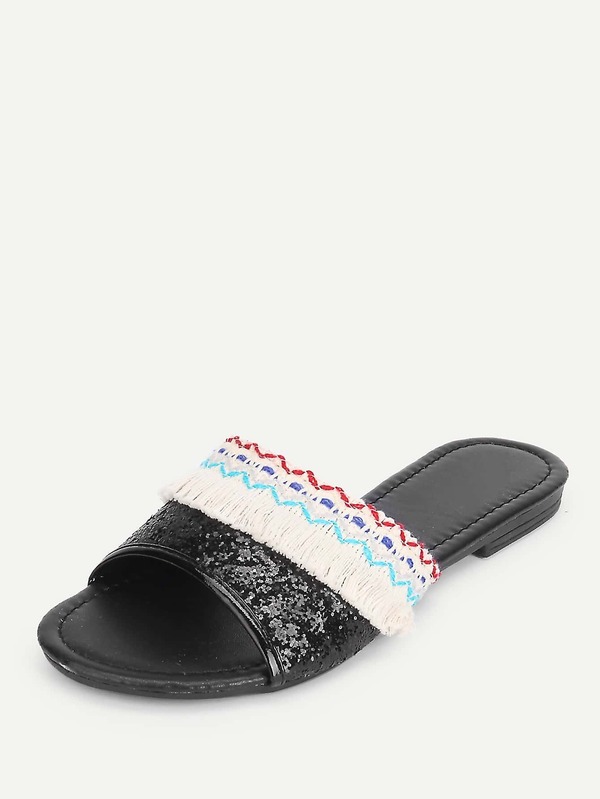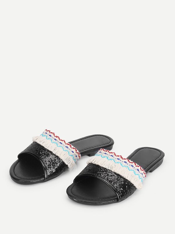 Glitter Fringe Trim Flat Sandals