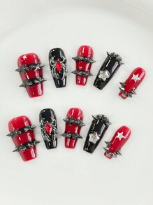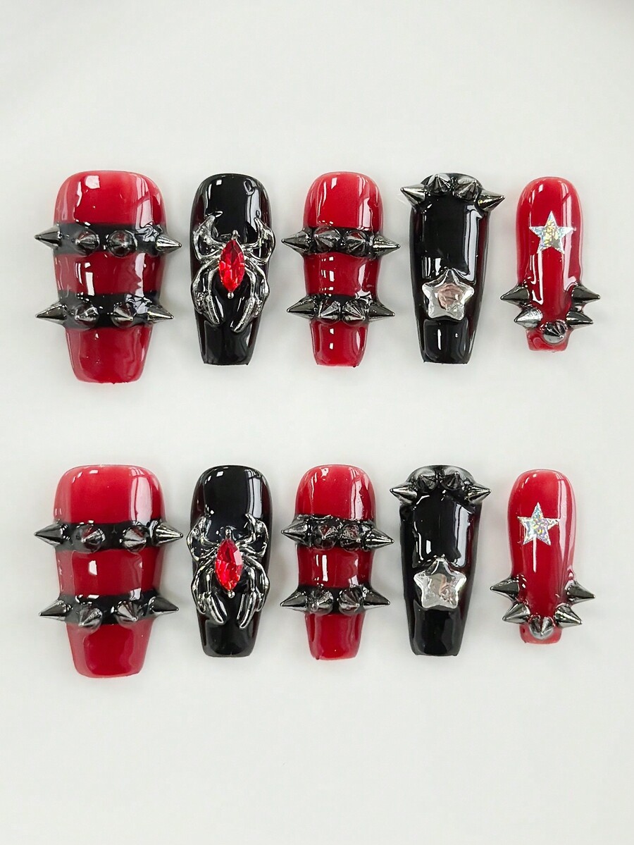 10pcs High-Quality Handmade False Nails With Dark Style Rivets, 3pcs Double-Sided Tape, Y2K Gothic Punk Nail Art, Removable Contrast Color Hand-Painted Nail Stickers, Suitable For Festivals, Parties, Dance And Daily Wear