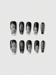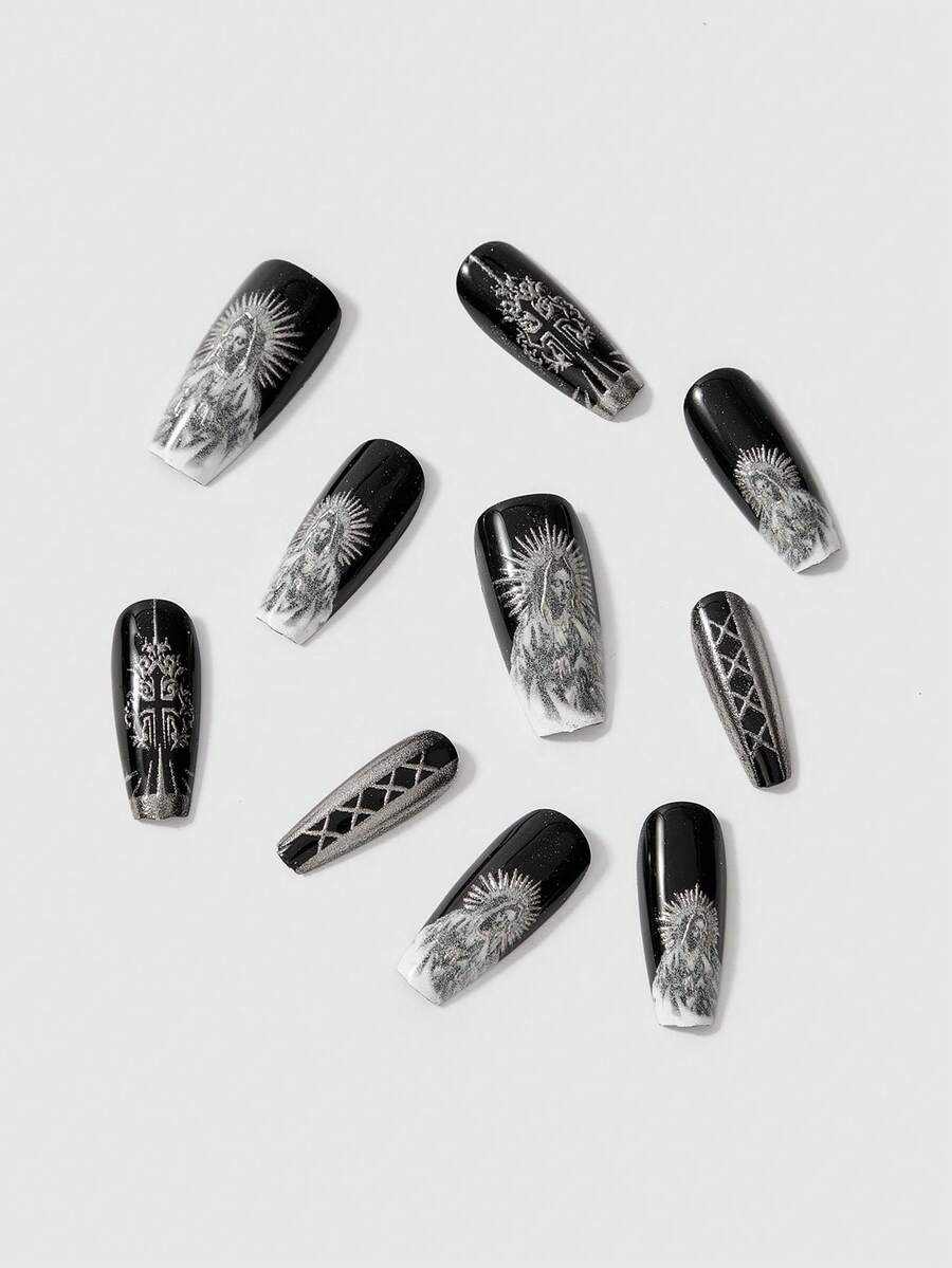 Goth 10pcs/Set Extra Long Cross Virgin Mary Patterned Gold Foil Reusable False Press On Nails For Women/Girls, Fake Nails Suitable For Stage, Party, Includes 1pc Jelly Gel And 1pc Scraper Stick, Black And White
