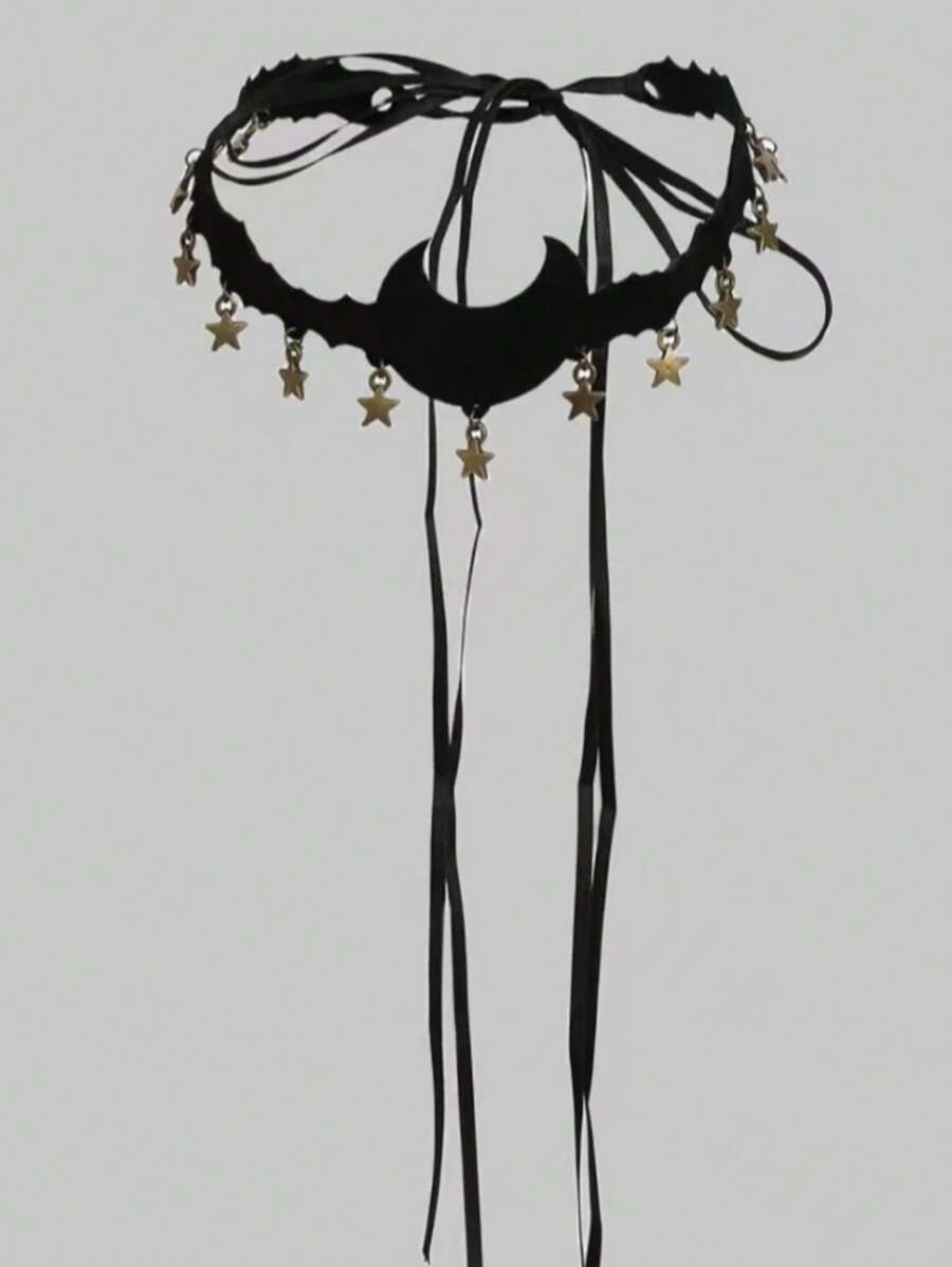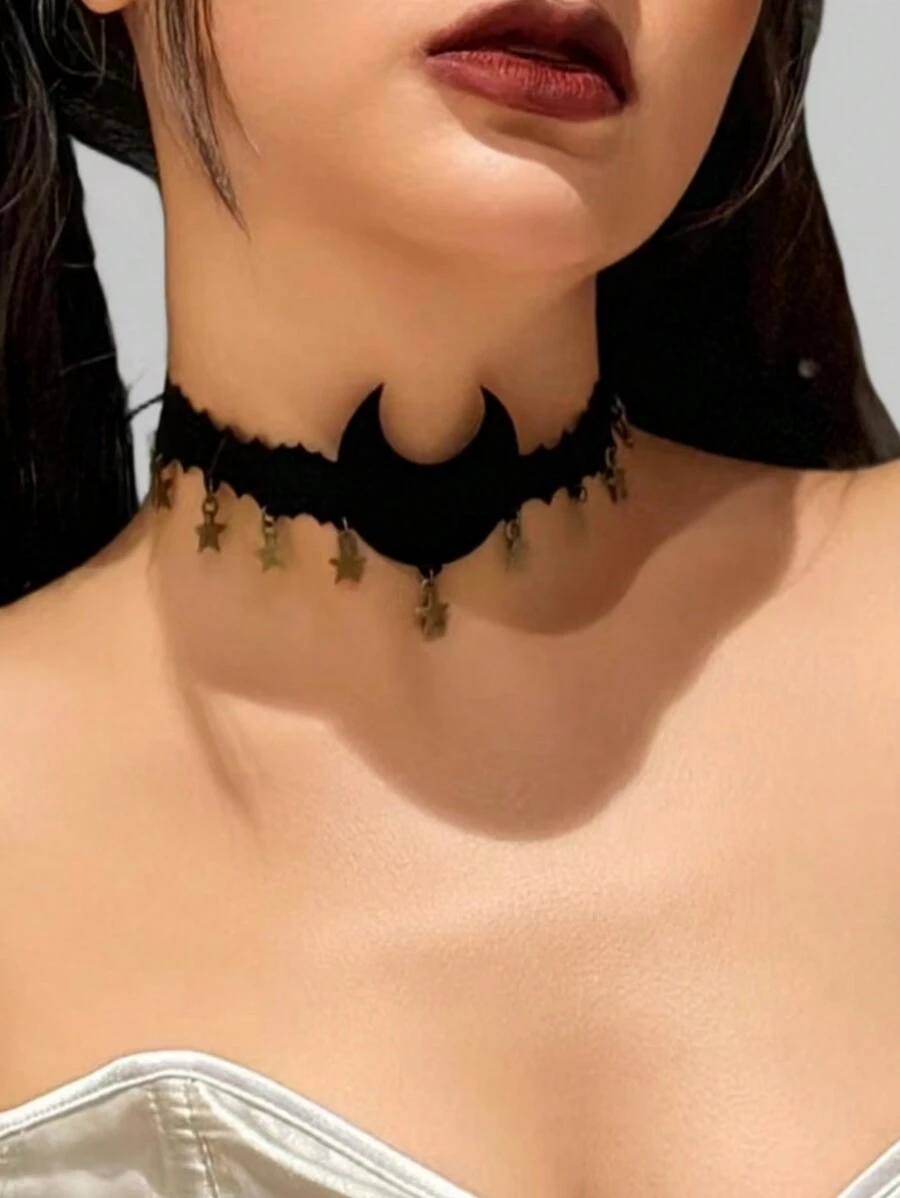 Grunge Punk 1pc Cool Black Crescent Moon & Star Pendant Necklace, Gift For Friend