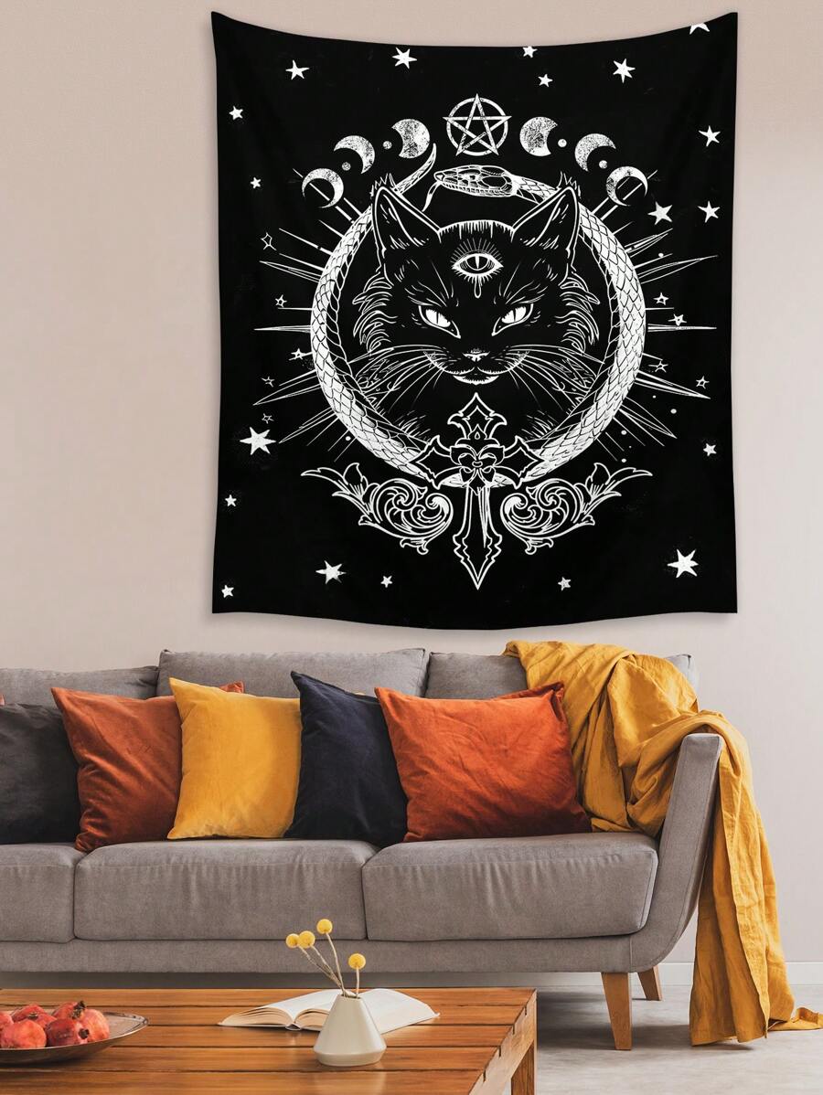 Goth 1pc Hand-Painted Mysterious Cat, Star And Moon Pattern Polyester Tapestry, Suitable For Living Room, Bedroom Wall Decor, Camping Decor, All Seasons Wall Hanging