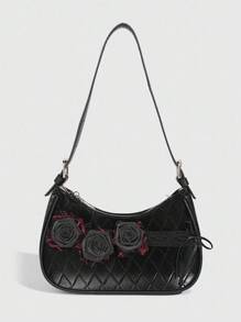 1pc Vintage Gothic Style Black Dried Rose Shoulder Bag, Rhombus Plaid Black Mini Square Bag, High-End Niche Underarm Bag Crescent Bag (2 Shoulder Straps)