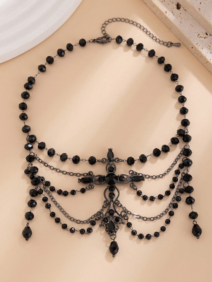 Goth 1pc Women Fall Halloween Multi-Layer Black Crystal Beaded Cross Necklace