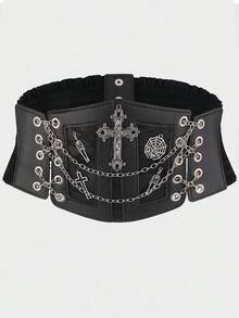 Goth 1pc Women's Black Lace Chain Skeleton Cross Tie Decor Goth Style Elastic Waist Belt Dress Accessory For Halloween Costume