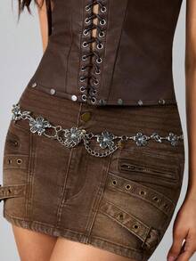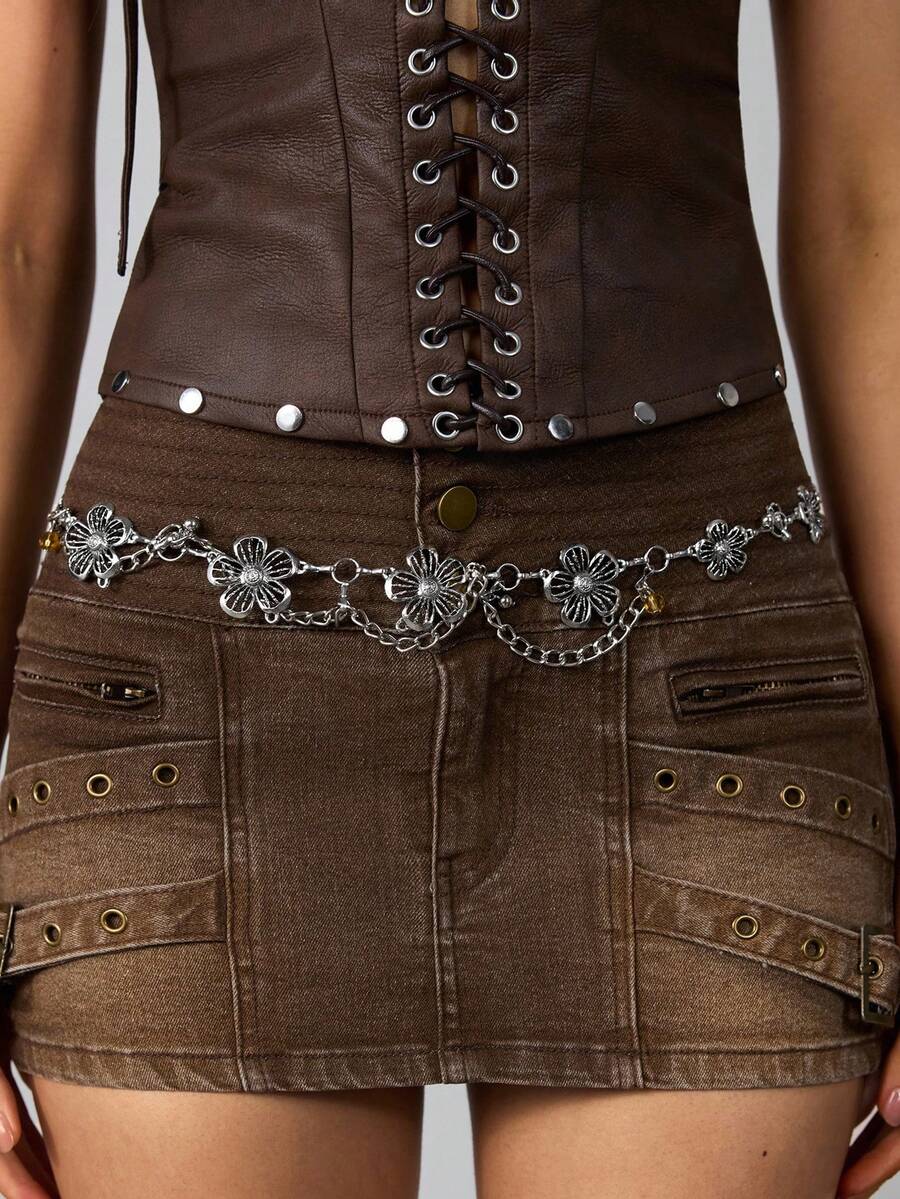 Goth 1pc Women's Silver Hollow Flower Pendant Decoration, Yellow Bohemian Western Style Waist Chain, Versatile Dress Accessory For Daily Wear