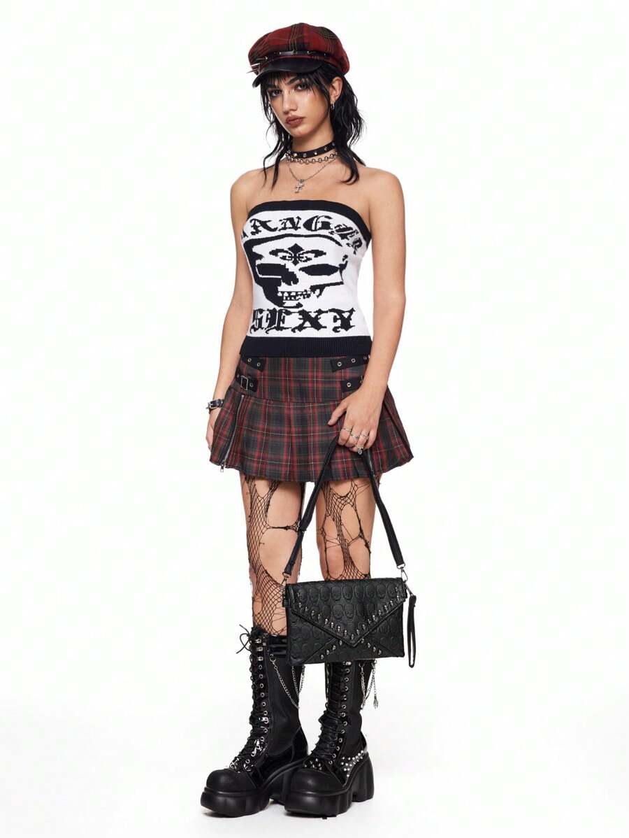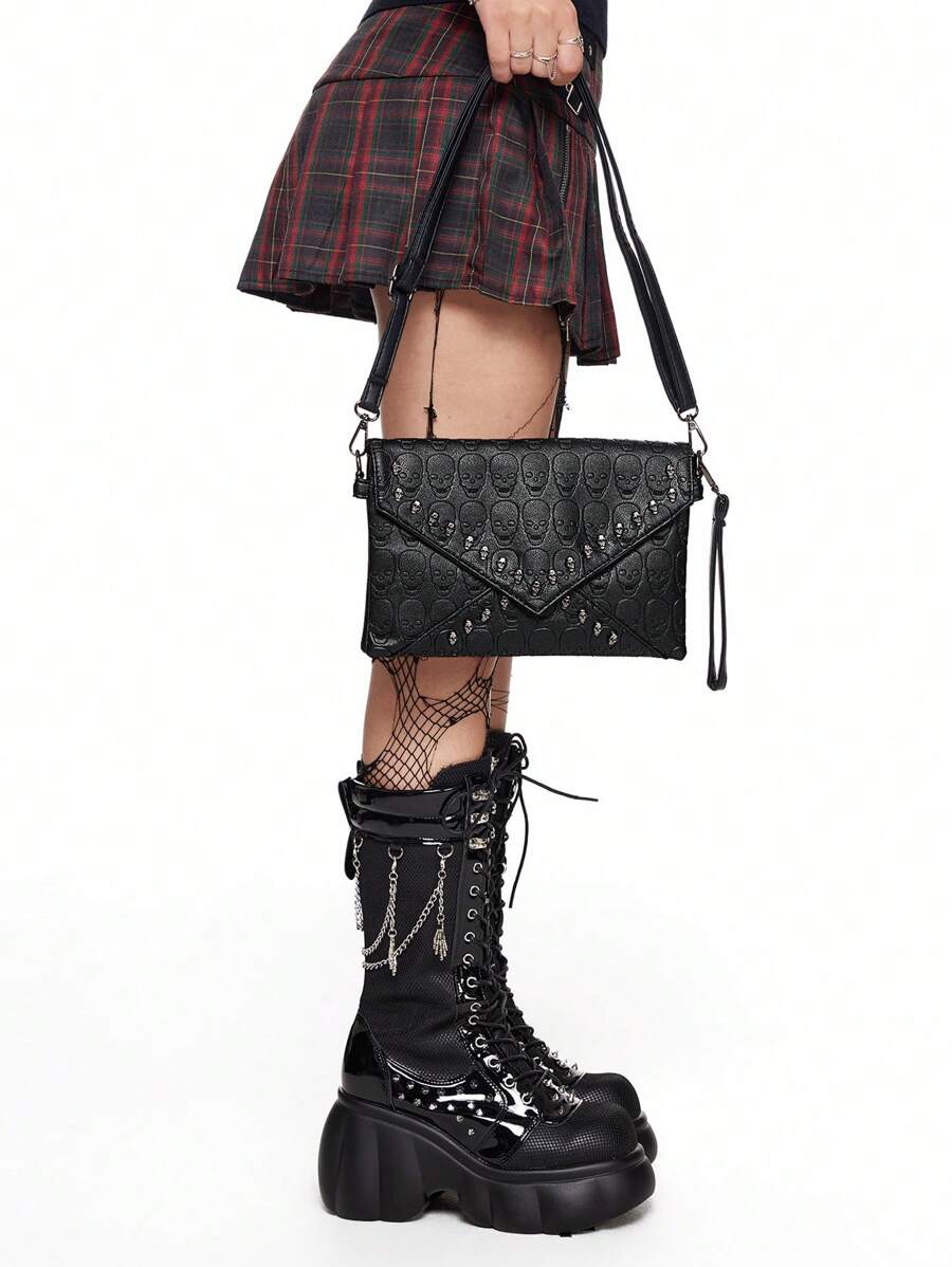 1pc Women's Skull Metal Decor Black Shoulder Envelope Messenger Bag, Gothic Style