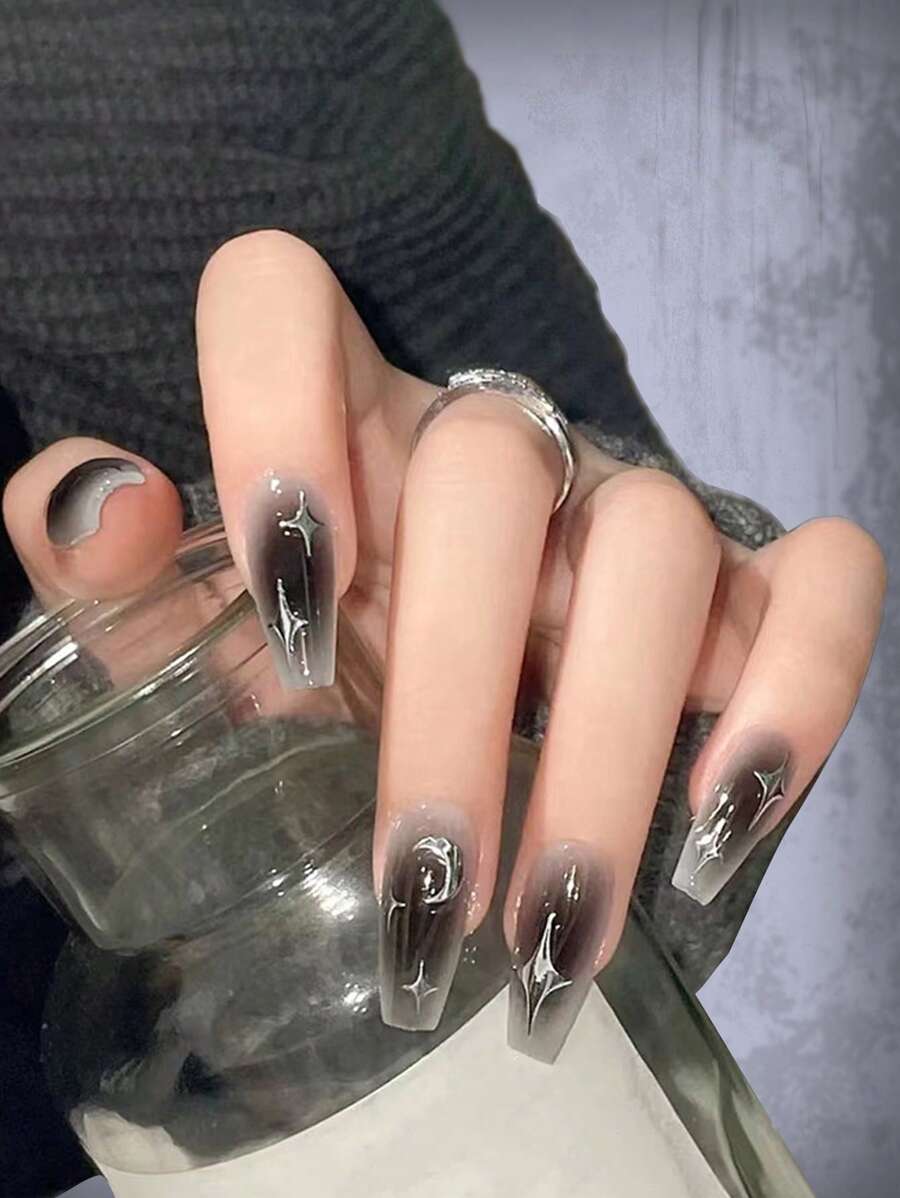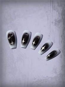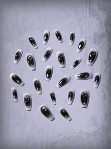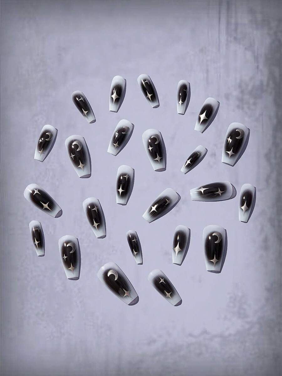 Goth 24pcs Coffin Moon Print Fake Nail & 1sheet Tape