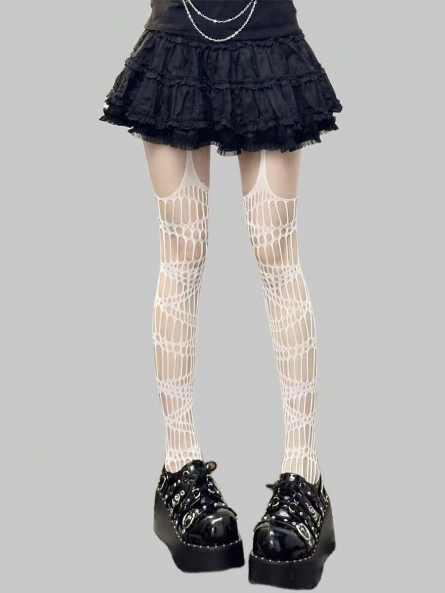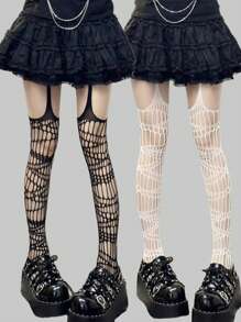 Goth 2pairs Women's All-Season Hollow Out Lace Top Thigh High Stockings, Black And White Combo