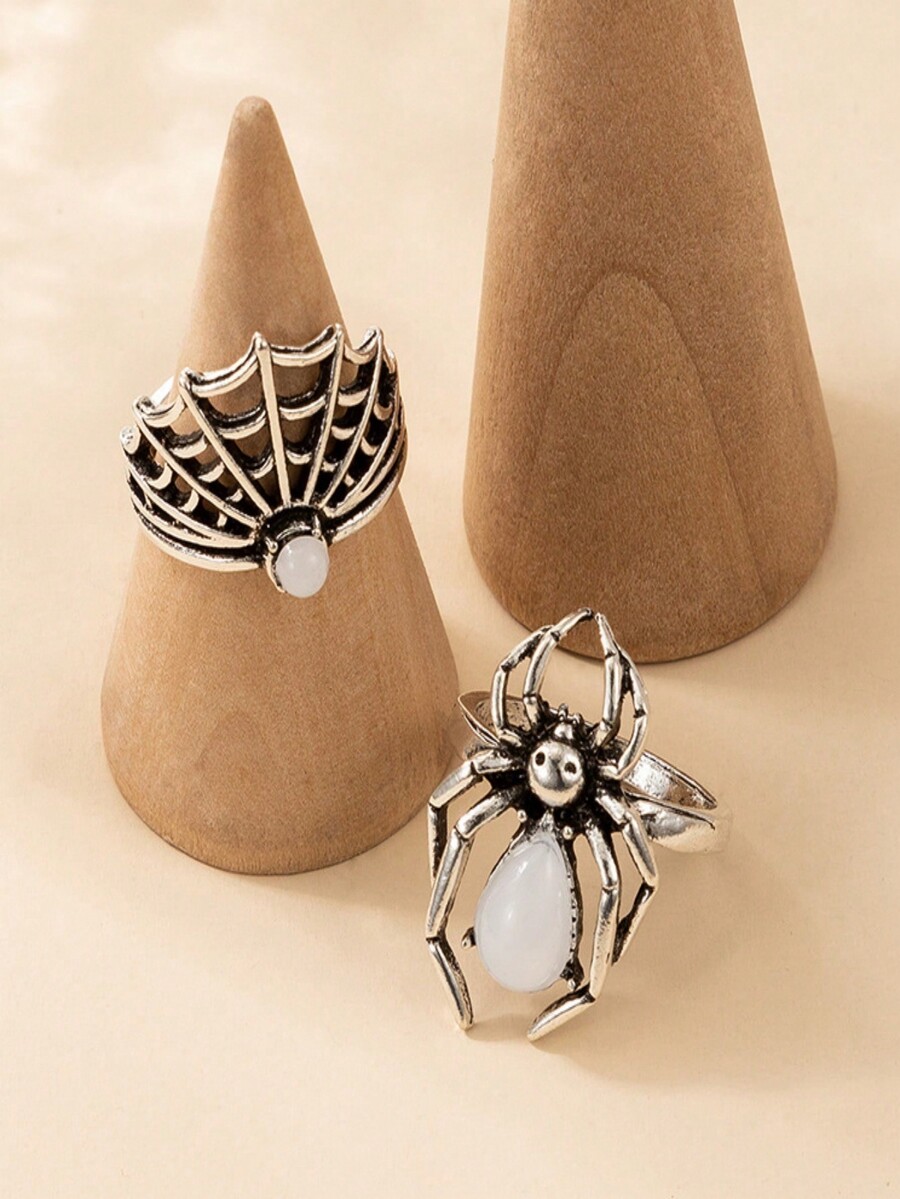 Goth 2pcs/Set Spider Web Shaped Vintage Exaggerated Ring With Asymmetric Spider Shaped Hollow Out Design