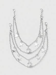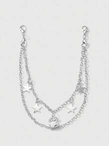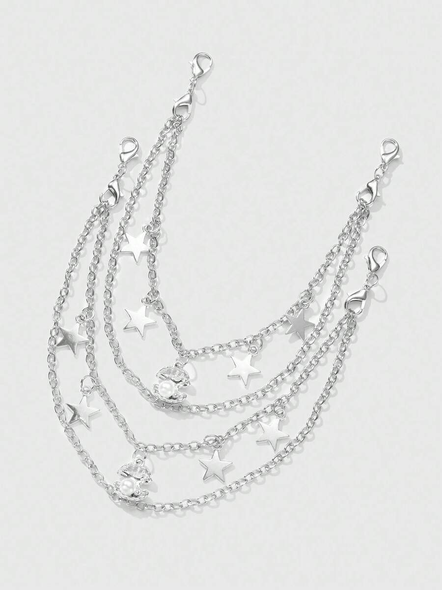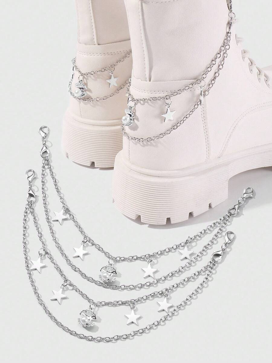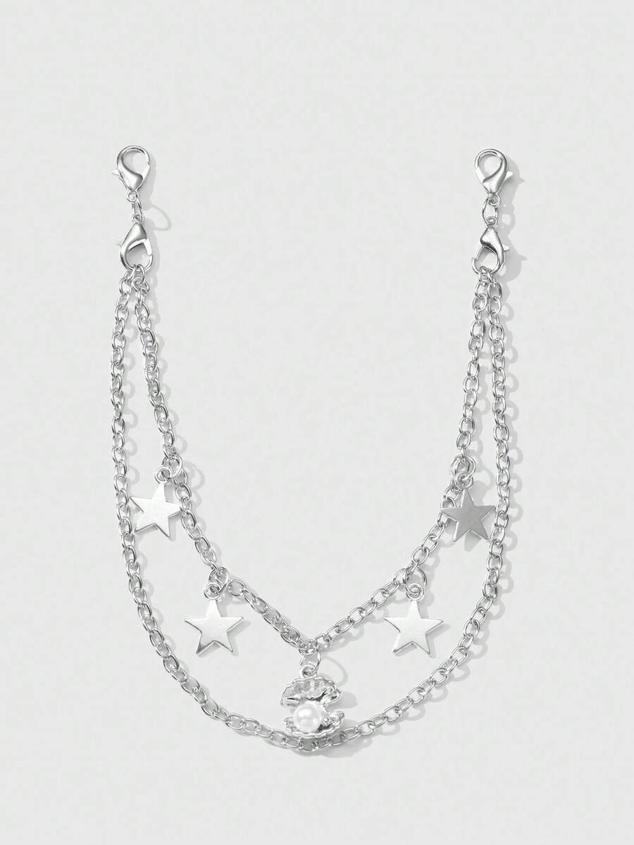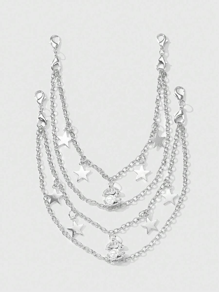 Goth 2pcs Y2K Minimalist Chic Versatile Hollow Silver Chain Stars & Faux Pearl Shell Charm Double Head Adjustable Lobster Clasp Shoe Lace Decoration, Suitable For Women/Girls Daily Outfit And Shoes, Holiday Gift