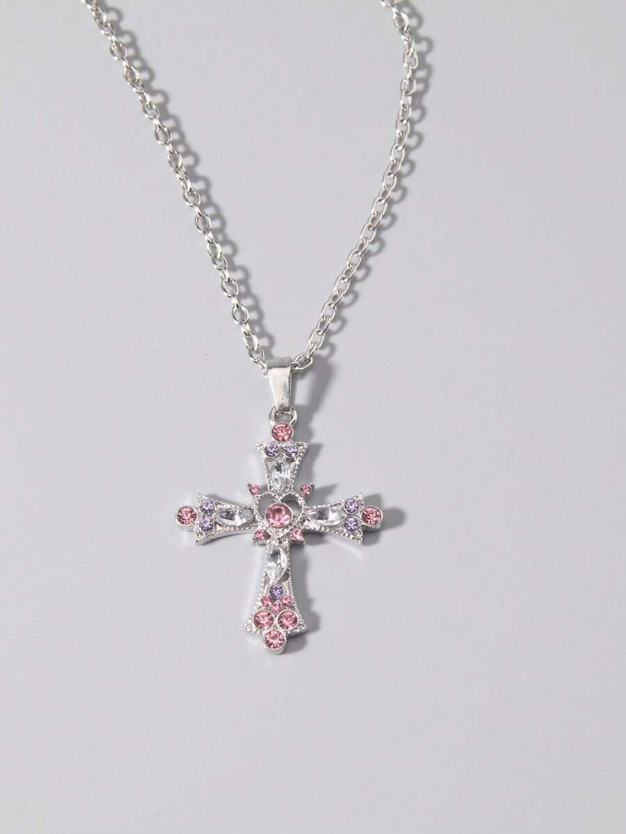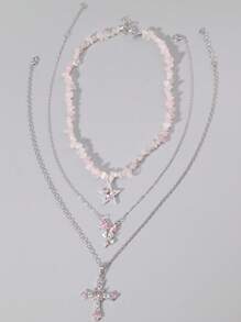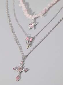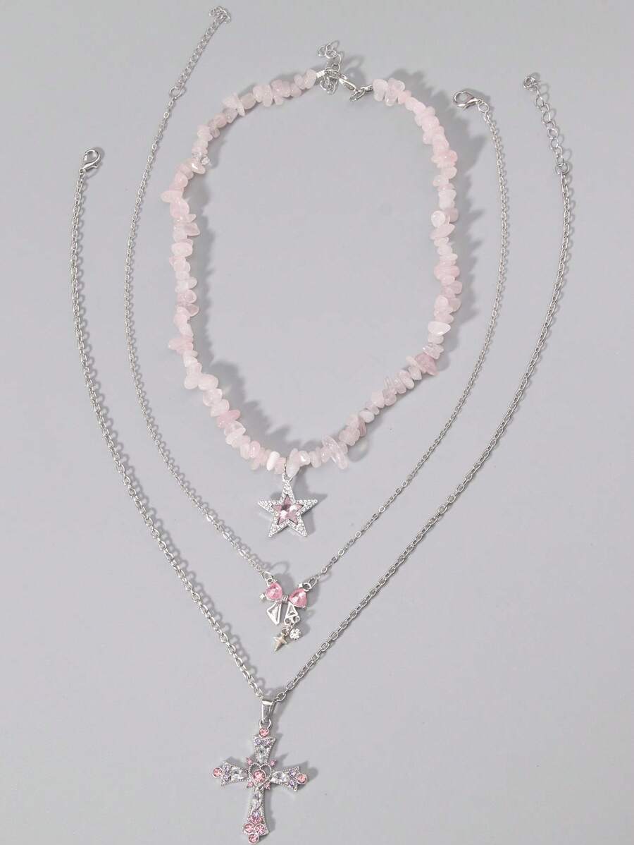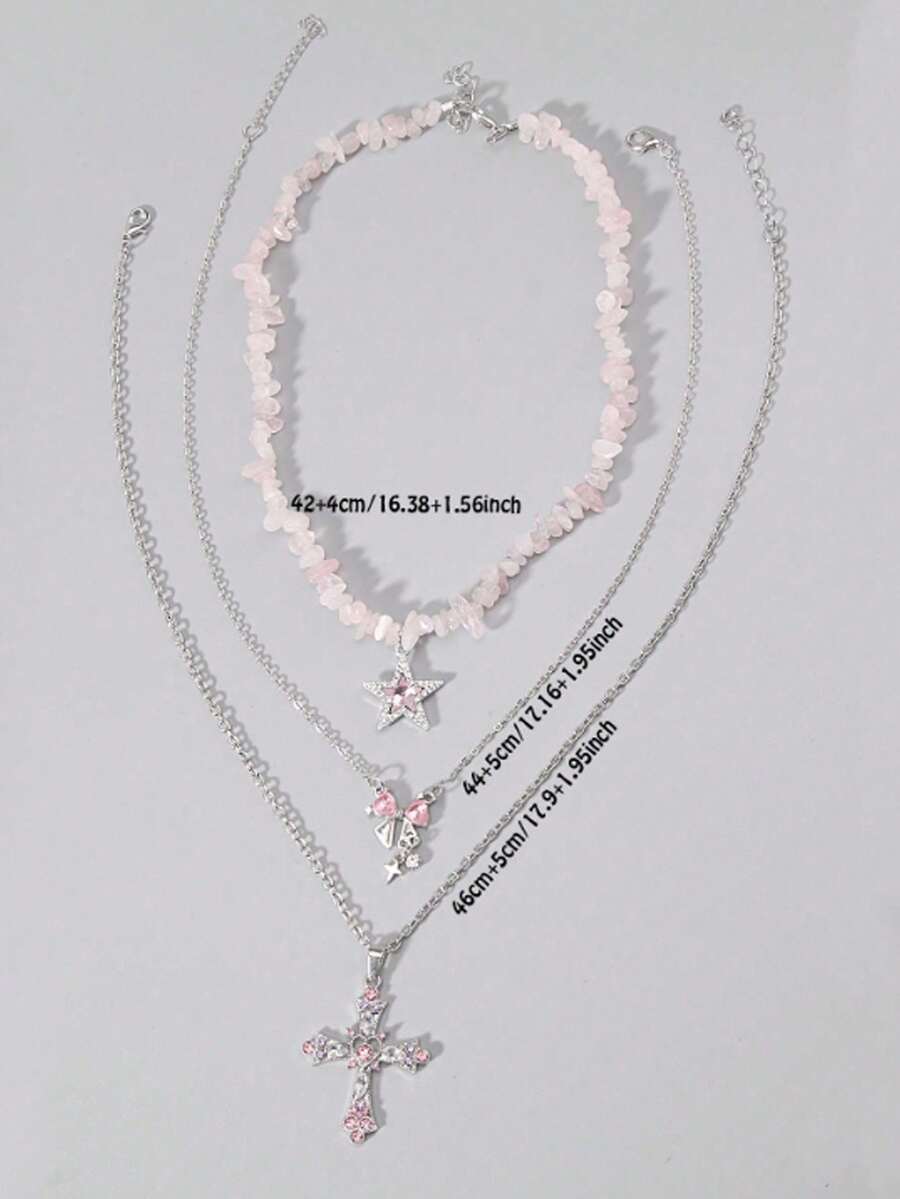 Goth 3pcs Y2K Luxury Artificial Crystal Cross, Pentagram, Bowknot Necklace Set For Women