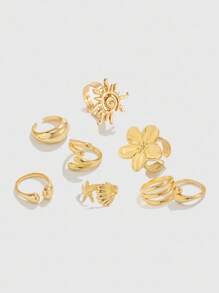Goth 8pcs Fashion Ocean Style Rings, Glossy Starfish, Flower, Spiral, Sun, Geometric Metal Rings, Open Adjustable Gold Rings, Gift For Women/Daughter/Wife