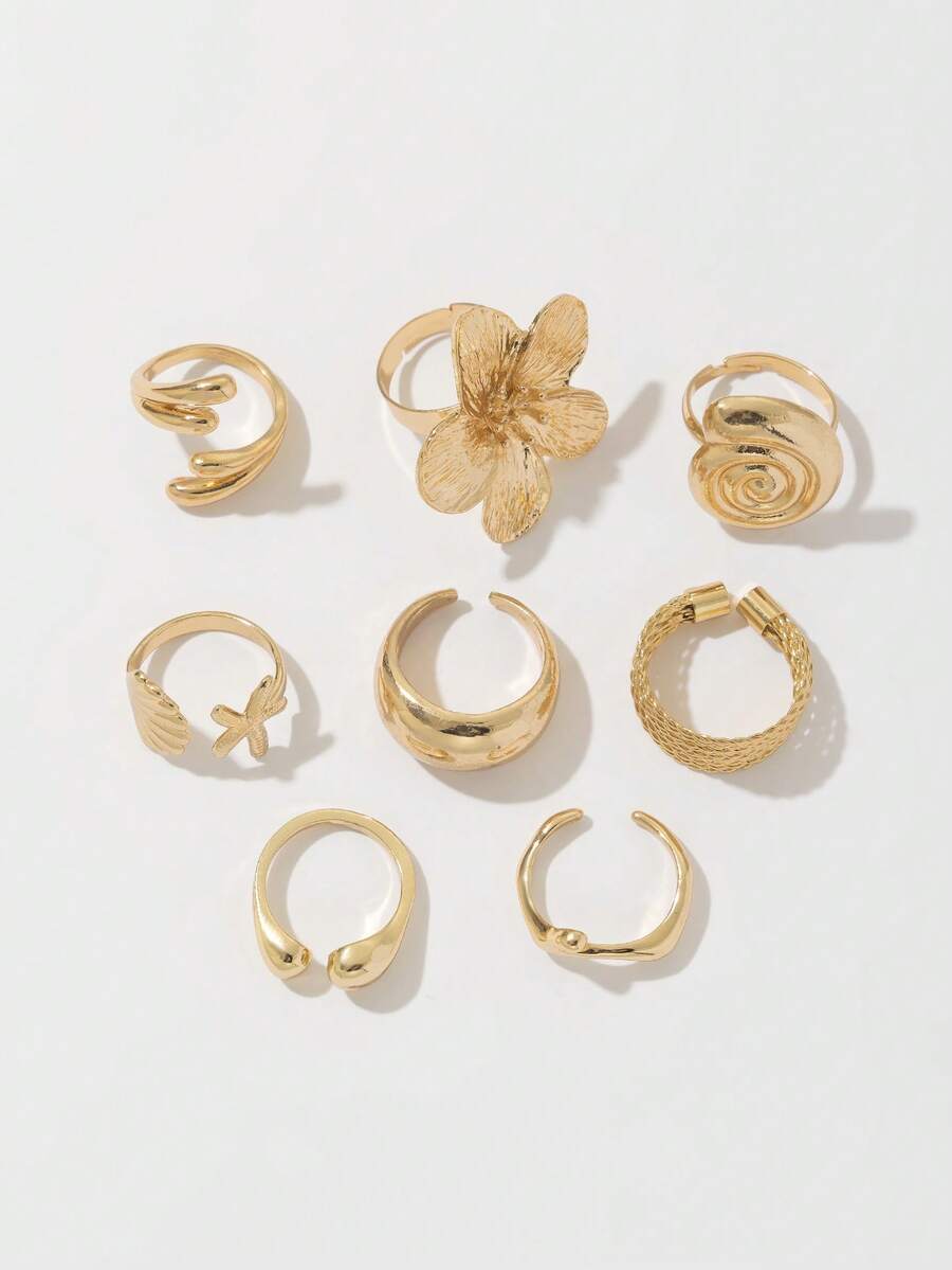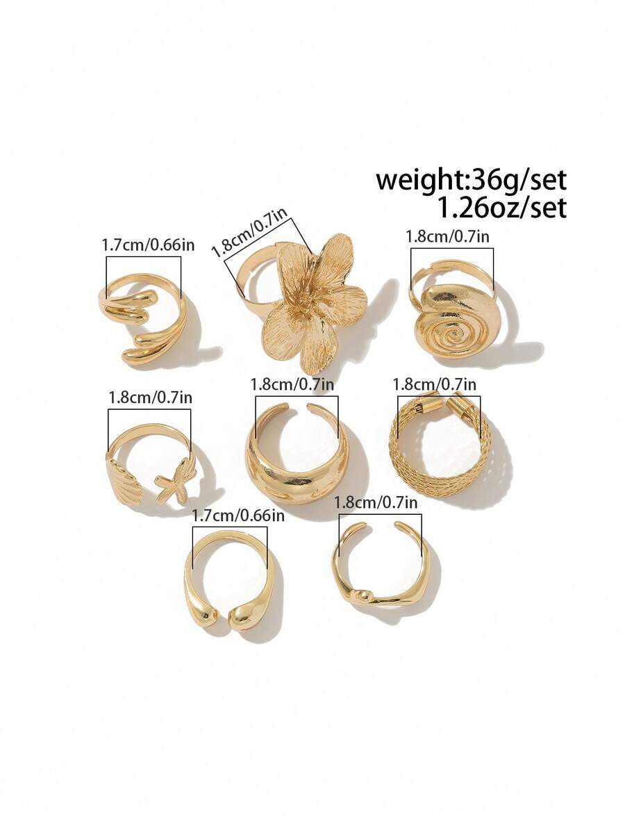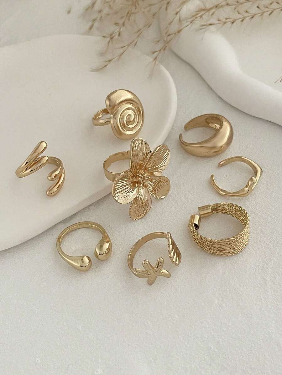 Goth 8pcs/Set Fashion Ocean Style Rings, Shiny Starfish Shell Flower Geometric Metal Open Rings, Gold, Gifts For Women/Daughter/Wife